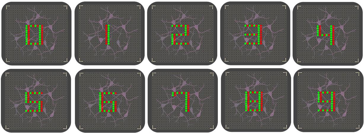 Specifically,the BRC system is built upon a high-density multi-electrode array (MEA) [4], which enables both electrical stimulation and high-resolution recording of neural activity. Neurons are derived from stem cells using established differentiation protocols [7,8],and once matured, they form spontaneously active networks. Input patterns are encoded as spatially distributed stimulation sequences and delivered to the culture via the MEA.The resulting neural responses are recorded and used to construct feature vectors for downstream classification. To evaluate the ability of our BRC system to generate discriminative feature representations,we conducted an experimental study focused on a single yet challenging pattern recognition task: the classification of ten digit-like spatial input patterns (from O to 9).Each pattern was defined by a distinct spatial configuration of electrical stimulation sites on a multi-electrode array (MEA). The evoked neural responses were recorded and used as features for a simple readout layer to classify the stimulus category.