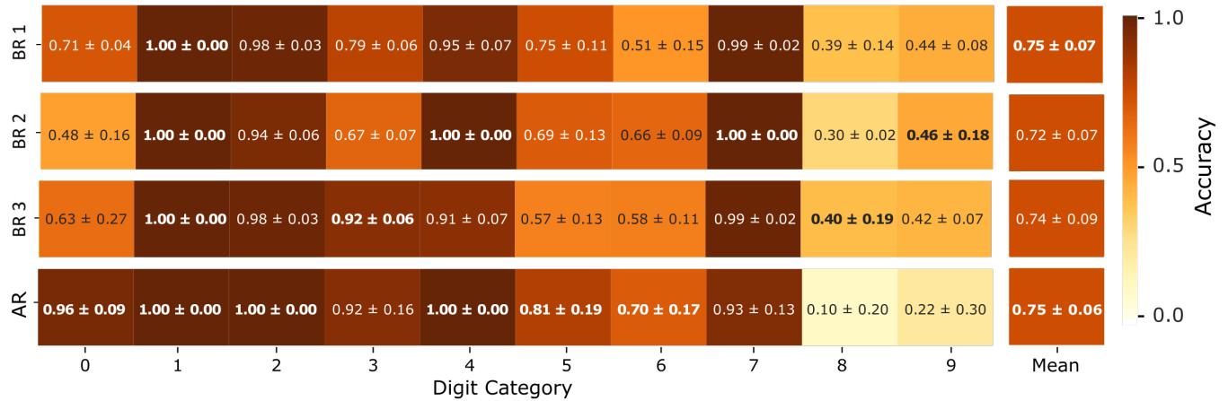 Figure 6. Mean classification accuracy per input category for each biological replicate. Each box displays the average classification accuracy for a given stimulus category, computed over multiple stimulation sessions for each single biological replicate (BR 1, BR 2, BR 3). Accuracies are calculated using 5-fold cross-validation within each session and then averaged across the three stimulation sessions (Day 1, Day 2, Day 3). The last row in the heatmap displays the average classification accuracy per category computed over different realizations of the noise for the Artificial Reservoir (AR).
