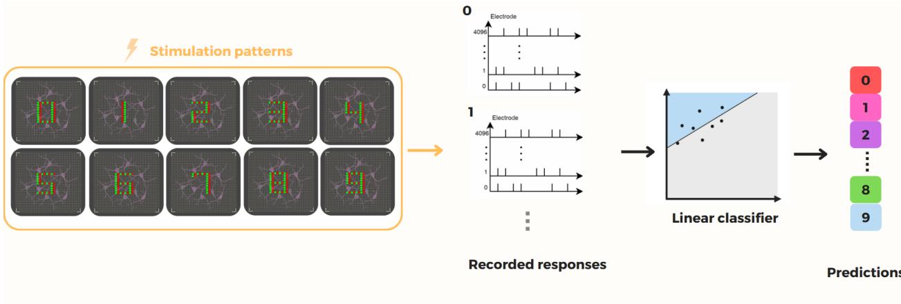 Figure 1. Framework of our Biological Reservoir Computing (BRC) paradigm. In this approach, a multi-electrode array (MEA)functions as a bidirectional interface, enabling both the stimulation of and the recording from a cultured biological neural network. Discrete inputs are encoded by selectively activating specific subsets of MEA electrodes, which deliver targeted stimuli to the network. The evoked spiking responses are captured via a separate set of electrodes and transformed into high-dimensional vectors that encode the input within a latent computational space. Due to the inherent complexity and rich dynamics of the biological reservoir, this transformation is intrinsically nonlinear. Subsequently, a linear classifier is trained to infer the category of the original input from its corresponding latent representation.