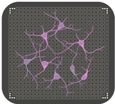 Figure 2. Illustration of a cultured biological network plated on a MEA device.Each square represents a single MEA electrode. Input patterns are mapped onto the MEA by assigning elements of the patterns to specific electrodes.Electrical pulses are delivered based on the corresponding input intensities,and the evoked activity of the network is recorded via the remaining electrodes.The resulting spiking responses are used to construct a high-dimensional representation of the input in the feature space of the biological reservoir.Neuron scale in the figure is not to scale and is adjusted for visibility.