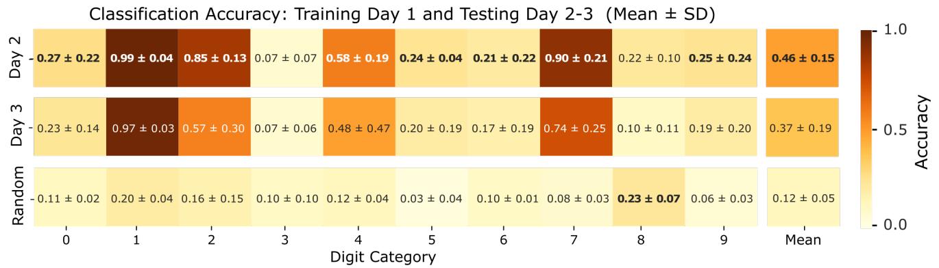 In order to assess the stability and generalizability of stimulus-evoked responses over time, we evaluated the classification performance of the classifier trained on data from the first stimulation session and subsequently tested it on data collected in the following days. This cross-day testing approach allows us to probe whether the neural dynamics elicited by a specific set of stimuli remain consistent across days,or if they are subject to spontaneous drift and reorganization.