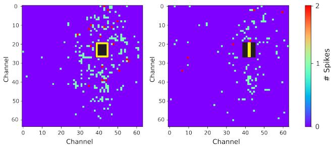 Figure 4. Heatmaps of neural activity following stimulation: The left panel shows the recorded response within a time window following stimulation with the input pattern ,while the right panel depicts the corresponding response for the input pattern . The heatmaps illustrate the spatial distribution of spiking activity across the MEA electrodes.