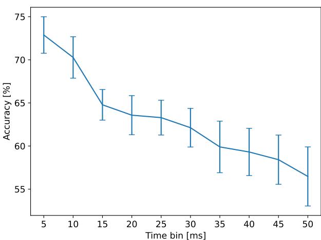 Figure 5. Accuracy variation across different readout windows.For each stimulation session ,classification accuracy was computed using neural responses extracted from different post-stimulus time windows,ranging from 5 to .The plot reports the mean accuracy standard error of the mean (SEM). This analysis highlights how the temporal integration window influences the effectiveness of the reservoir readout.