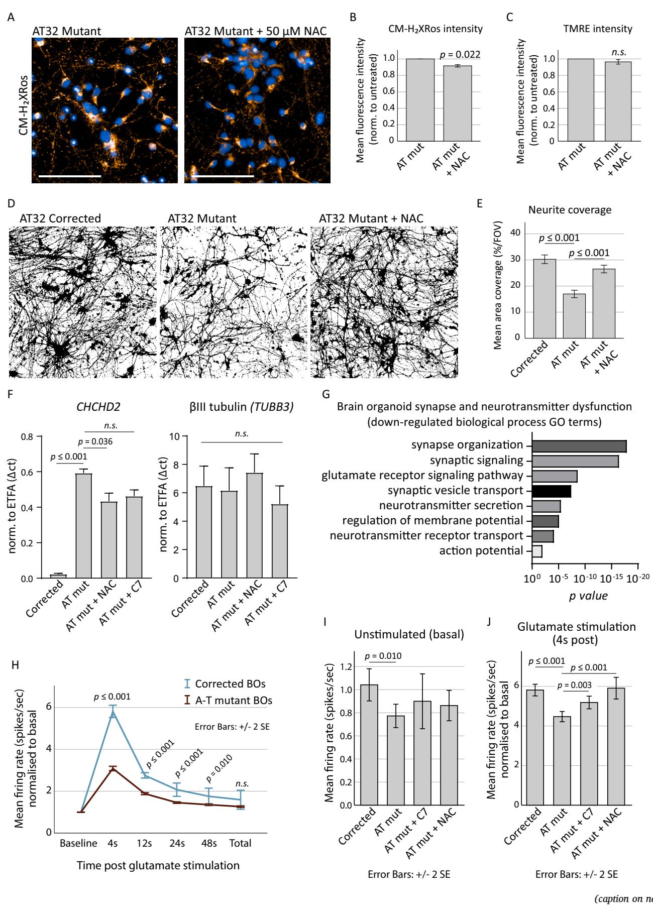 A) AT32 mutant neurons were treated with the antioxidant NAC for 10 days before oxidative stress levels were measured by CM-H2XRos. Scale bar 100 μm. B) CMH2Xros fluorescence intensity was reduced following NAC treatment; t (Bakkenist and Kastan, 2003) = 4.388, p = 0.022, though TMRE fluorescence intensity ©remained unchanged in the treated neurons; t(3) = 1.963, p = 0.072. Error bars mean ± SE. D) Representative binary βIII-tubulin immunochemistry of 3 independentAT32 corrected, mutant, and NAC treated mutant neuronal cultures. E) Binary βIII-tubulin immunochemistry was quantified to calculate the percentage coverage per FOV; F(2, 80) = 17.599, p ≤ 0.001, with Tukey post hoc analysis identifying a significant reduction (p ≤ 0.001) in mutant neurons compared to corrected, and a significant correction (p ≤ 0.001) of this phenotype with NAC treatment. Error bars mean ± SE. F) Total RNA was harvested from AT32 mutant and corrected neurons and used to quantify the mRNA expression levels of CHCHD2 and TUBB3. Mutant neuronal cultures were treated with either NAC or C7. ETFA was used as housekeeper gene. ANOVA [F(5, 15) = 57.26, p ≤ 0.001] and Tukey post hoc analysis determined significant differences in CHCHD2 mRNA levels, p values as indicated. TUBB3 mRNA expression remained unchanged [F(5, 18) = 0.2079, p = 0.955]. 3 independent replicates, error bars mean ± SD. G) GO analysis conducted on up and down DEGs separately identified significant downregulation of pathways involved in synapse function and neurotransmitter signalling. H) Brain organoids were adhered to electrode chips and baseline electrical activity was recorded, followed by addition of glutamate, using an MEA platform. Mean firing rate (spikes per second) were calculated in time windows post stimulation with glutamate (4, 12, 24, 48 and total seconds post glutamate addition) and normalised to the basal firing rate. Student’s t-test was used to determine significance, p values as indicated. Corrected organoids; 2834 active electrodes from 6 organoids on 4 MEA chips. Mutant; 4510 active electrodes from 5 organoids on 3 MEA chips. Error bars mean ± 2 SE. I-J) AT32 mutant brain organoids were treated with C7 and NAC for two weeks before being adhered to electrode chips. Baseline electrical activity was recorded, followed by addition of glutamate. Mean firing rate (spikes per second) were calculated for baseline and for glutamate stimulation normalised to baseline. (I) Significance was determined by Welch’s ANOVA for baseline neuronal activity [F (3,5491) = 3.286, p = 0.020] and Games-Howell post hoc analysis found a significant reduction in baseline firing in mutant compared to corrected (p = 0.01). (J)Glutamate stimulation revealed significant differences between untreated and treated mutant organoids [F(3,6435) = 18.428, p ≤ 0.001, Games-Howell post hoc analysis as indicated]. Error bars mean ± 2 SE. GO; gene ontology. MEA; multi-electrode array. NAC; N-acetyl cysteine. C7; heptanoate.