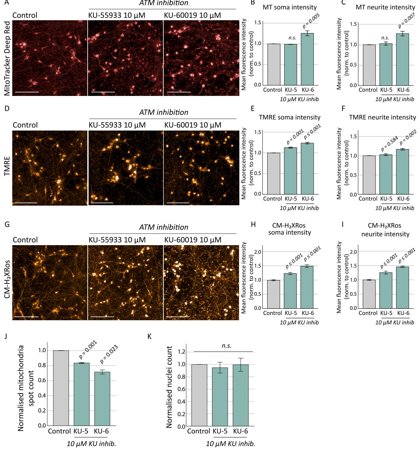 Control neurons were treated with ATM inhibitors KU-55933 and KU-60019 (10 μM) for 10 days prior to mitochondrial assessment at 4 weeks. Neurons were stained with MitoTracker Deep Red (A), and KU-60019 treatment caused increases in fluorescence intensity in both soma [B; F(2, 8) = 19.001, p = 0.003] and neurite puncta [C; F(2, 8) = 13.918, p = 0.006] as determined by ANOVA, with Tukey post hoc analysis identifying p values of 0.005 and 0.007 respectively. KU-55933 made no significant differences to mitochondrial content. D) TMRE staining to measure membrane potential identified an increase in fluorescence levels in both soma and neurite staining following KU-55933 and KU-60019 treatments. E) Soma TMRE intensity: F(2, 8) = 78.289, p ≤ 0.001; Tukey post hoc analysis KU-55933 p = 0.001, and KU-60019 p ≤ 0.001 compared to control. F) Neurite TMRE intensity: F(2, 8) = 23.535, p = 0.001, Tukey post hoc analysis KU-55933 p = 0.584 and KU-60019 p= 0.002. G) CM-H2XRos fluorescence increased following chemical inhibition of ATM signalling, indicating a significant oxidative stress phenotype. (H) Soma CMH2XRos fluorescence intensity: F(2, 18) = 49.530, p ≤ 0.001; Tukey post hoc analysis: p ≤ 0.001 and p ≤ 0.001 for KU-55933 and KU-60019 respectively, and (I) neurite CM-H2XRos fluorescence intensity: F(2, 18) = 33.655, p ≤ 0.001; Tukey post hoc analysis: p ≤ 0.001 and p ≤ 0.001 for KU-55933 and KU-60019 respectively. J) ATM chemical inhibition resulted in a significant reduction in number of mitochondrial puncta (spot count) located in neuronal processes [F(3,11) = 28.117, p ≤0.001] for both KU-55933 (p = 0.001) and KU-60019 (p = 0.023), though ATM inhibition did not affect the number of neurons based on nuclei count [K; F(2, 8) =0.617, p = 0.571]. Treatments with inhibitors were normalised to untreated controls. Scale bars; 100 μm. Error bars are mean ± SE. KU-5; KU-55933. KU-6; KU-60019. (For interpretation of the references to colour in this figure legend, the reader is referred to the web version of this article.)