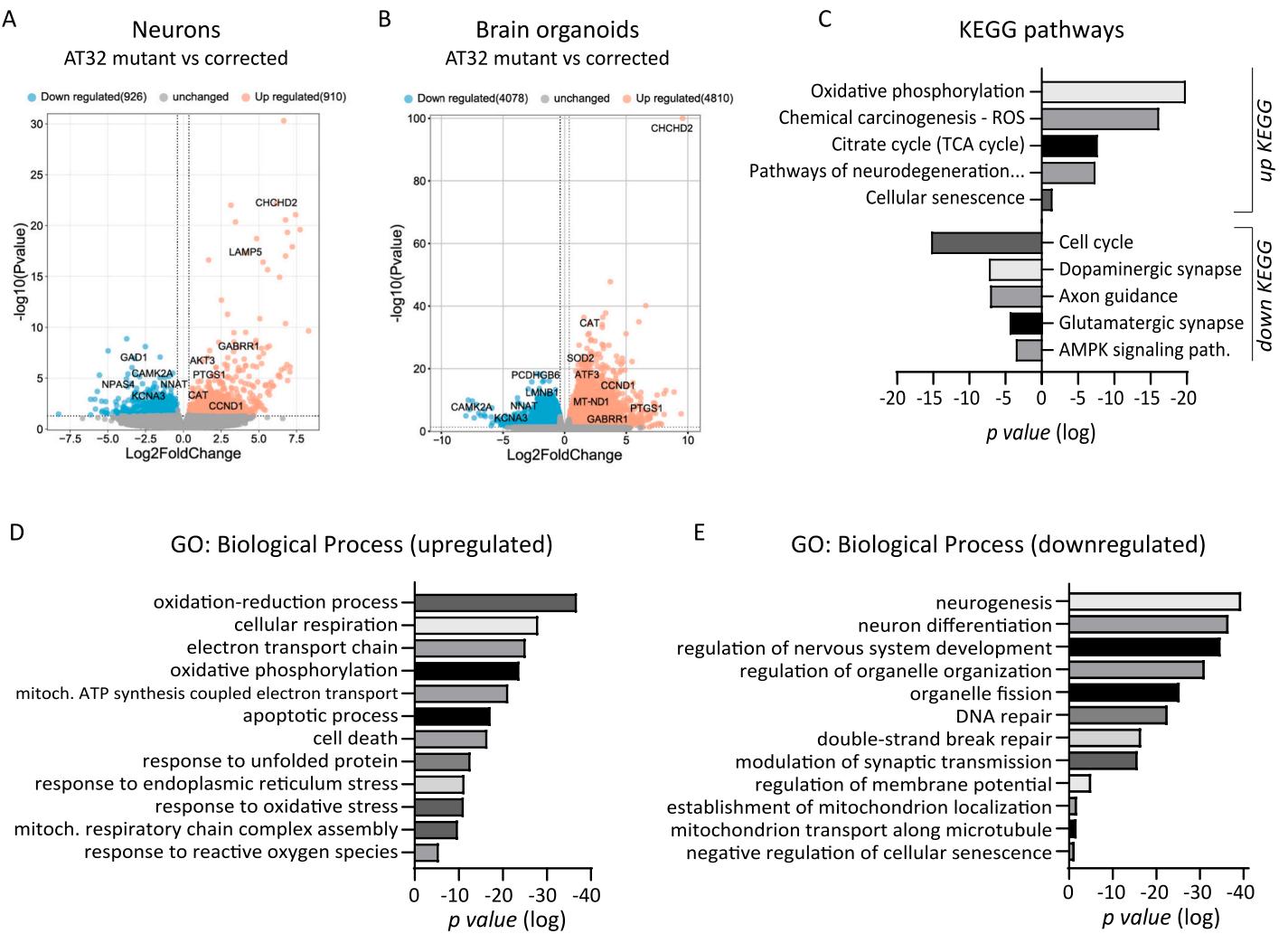 Fig.4. Transcriptomic analysis of AT32 neuron and brain organoid cultures. RNA sequencing was conducted on AT32 2-week-old neurons and 100-day-old brain organoids. A) Volcano plots showing comparison between AT32 mutant and gene corrected neurons identified 1836 DEGs (910 genes upregulated and 926 down regulated in the mutant compared to the corrected), while comparatively, 100-day-old brain organoids had nearly 9000 DEG (B; 4810 genes upregulated and 4078 down regulated in the mutant compared to the corrected). KEGG pathway © and GO analysis (D, E) were conducted on up and down DEGs separately, and were enriched for pathways involved in mitochondrial processes, such as oxidative phosphorylation and electron transport chain, as well as response to stress processes including oxidative and ER stresses. DEG; differentially expressed gene. GO; gene ontology.