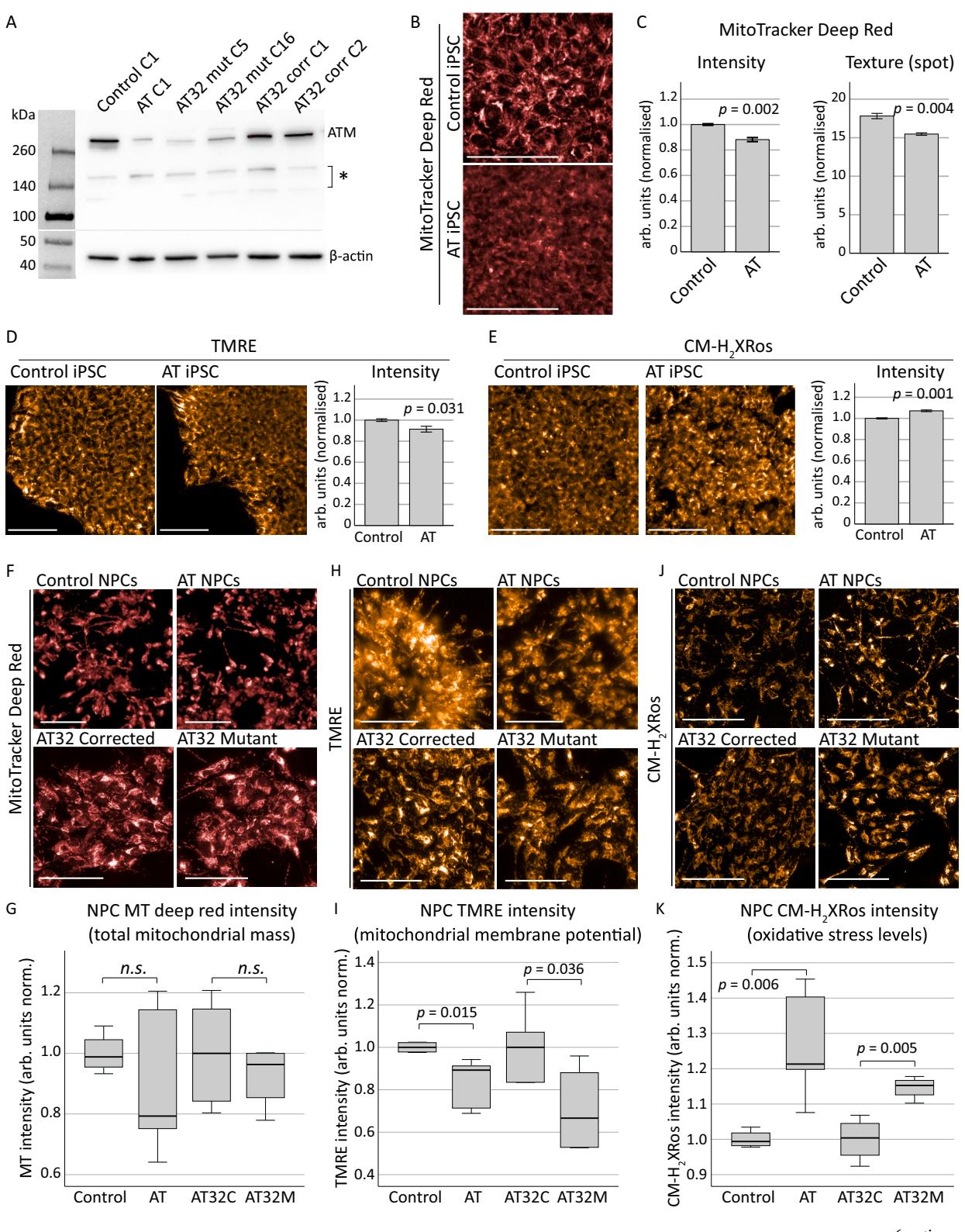 ATM is an important master regulator of mitochondrial homeostasis and oxidative stress as confirmed by studies in murine models (Kamsler et al., 2001; Quick and Dugan, 2001; Chen et al., 2003) and in human patient cells (Reichenbach et al., 2002; Ambrose et al., 2007; ValentinVega et al., 2Ol2).Despite this,the extent of mitochondrial dysfunction and oxidative stress in patient neuronal cells remained uncharacterised. Here we,for the first time,utilise patient primary cells and iPSCs to examine mitochondrial content,membrane potential and oxidative stress levels in human neural models across different stages of maturation, from stem cells and neuronal progenitors to 2D neuronal cultures, and finally,brain organoids.Our findings are of particular importance when considering AT neuropathology,especially given that current in vivo models do not manifest key neurological abnormalities,including neurodegeneration,that are consistently observed in individuals with AT (Lavin, 2013).