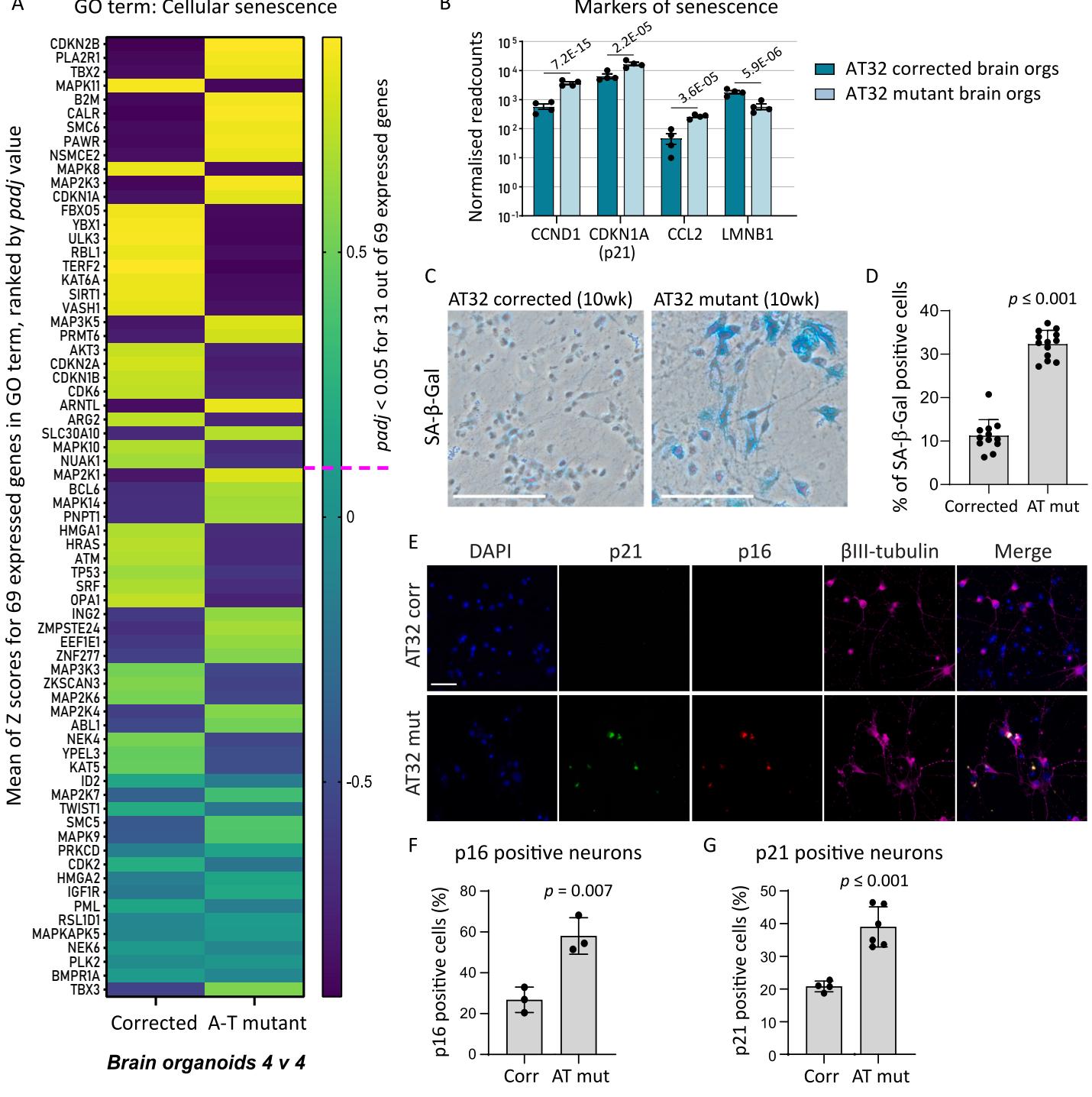KEGG pathway analysis (Fig.4) indicated an increase in cellular senescence in ATM mutant brain organoids,and we analysed the mean expression for all transcribed genes comprising the Cellular Senescence GO term (Fig.6A).Nearly half of the genes comprising this GO term were significantly dysregulated.Normalised read count assessment of brain organoids identified classical markers of senescence,including increased levels of CCND1,CDKN1A (p21)and CCL2 in mutant BOs, while LMNB1 was reduced (Fig. 6B).2-week-old neuronal cultures did not demonstrate significant differences (Fig.5A).To determine if senescence would become evident upon further neuronal maturation, we generated AT32 mutant and corrected neurons and matured them for 10 weeks.Following this extended maturation,we detected a 3-fold increase in the percentage of cells that exhibit senescence-associated galactosidase staining in AT mutant neurons (SA Gal; Fig. 6C, D). Significant increases in expression of pl6 and p21 were observed via immunochemistry in the aged neuron cultures,confirming senescence levels in AT mutant neurons are increased (Fig. 6E-G).