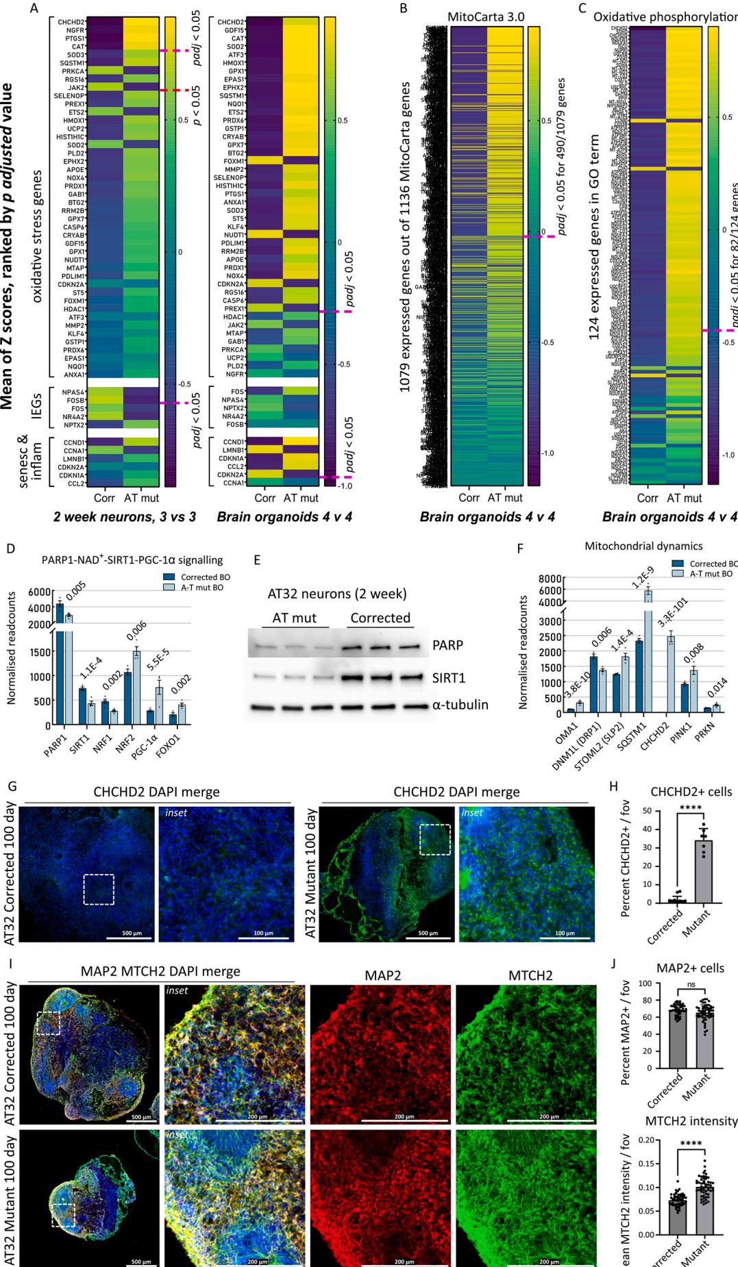 Fig. 5. Oxidative stress signatures and mitochondrial perturbances revealed in AT32 neurons and brain organoids A-C) The mean Z-scores were calculated from AT32 2-week-old neuron and 100-day-old brain organoid RNA sequencing data and were plotted as heatmaps for AT mutant and corrected, with genes ranked by their adjusted p value. The pink dashed line indicates where padj < 0.05 falls. A) A panel of oxidative stress markers,IEGs, and markers of senescence and inflammation were plotted comparing mutant and corrected neuron and brain organoids. B) The mean Z-scores of all expressed