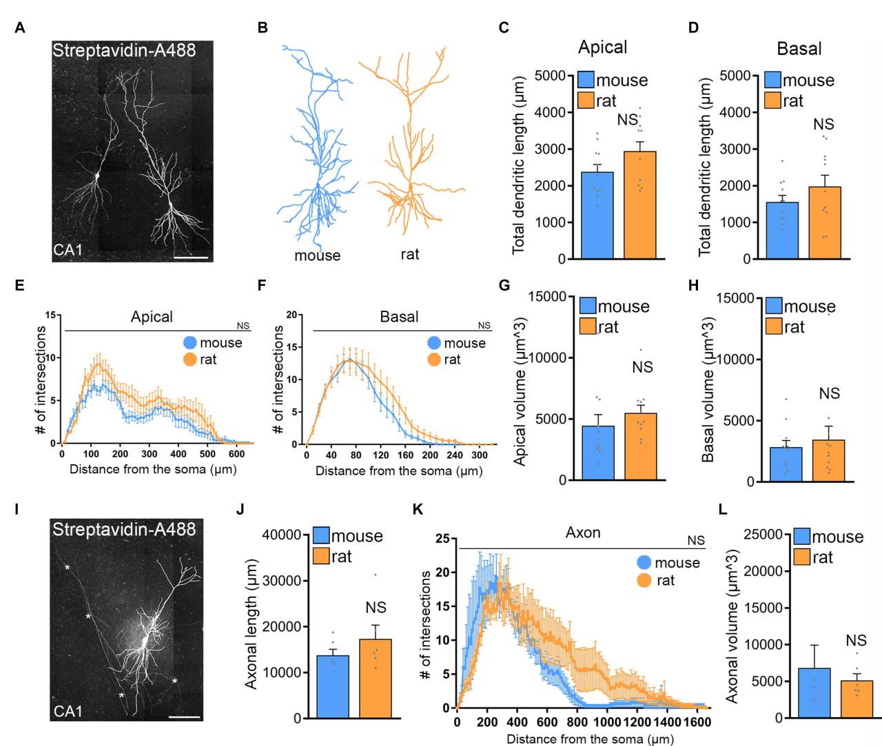 FIGURE 5 No significant morphological differences of CA1 pyramidal neurons in mouse and rat tissue cultures. (A) Examples of patched and biocytin-filled rat CA1 pyramidal neurons identified post hoc with streptavidin-A488, Scale bar, . (B) Examples of three-dimensional neuronal reconstructions of mouse and rat CA1 pyramidal neurons. (C–H) Group data of mouse and rat apical and basal dendrites (mouse, cells; rat, cells; statistical comparisons for panels (C,D,G,H) were performed with Mann–Whitney test; statistical comparisons for panels (E,F) were performed with 2-way ANOVA). (I) Rat CA1 pyramidal neuron patched and filled with biocytin, identified post hoc with streptavidin-A488, and used for comprehensive neuronal reconstruction, encompassing dendritic and axonal neuronal structures. Scale bar, . (J–L) Group data of mouse and rat axons [mouse, cells; rat, cells; statistical comparisons for panels (J,L) were performed with Mann–Whitney test; statistical comparisons for panel (K) were performed with 2-way ANOVA].