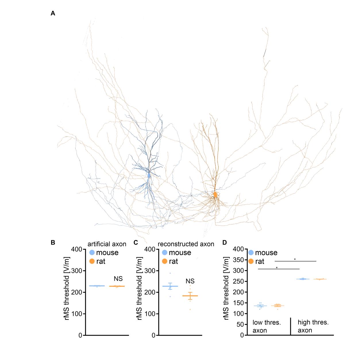 A noteworthy insight emerged from these simulations, confirming previous observations (e.g., Aberra et al., 2018, 2020): the axon’s influence is pivotal in establishing the rMS-induced depolarization threshold (Table 1). We followed up on this observation, by establishing connections between the axons responsible for the lowest and highest rMS depolarization thresholds across all mouse and rat cells. Indeed, an almost 2-fold difference in the depolarization thresholds was observed in these simulations across all reconstructed neurons (Figure 6D). Yet, despite these simulation results, the dissimilarity in rMS-triggered plasticity between mouse and rat tissue cultures remained unresolved, eluding a complete explanation based solely on the interactions of dendritic and axonal morphologies.