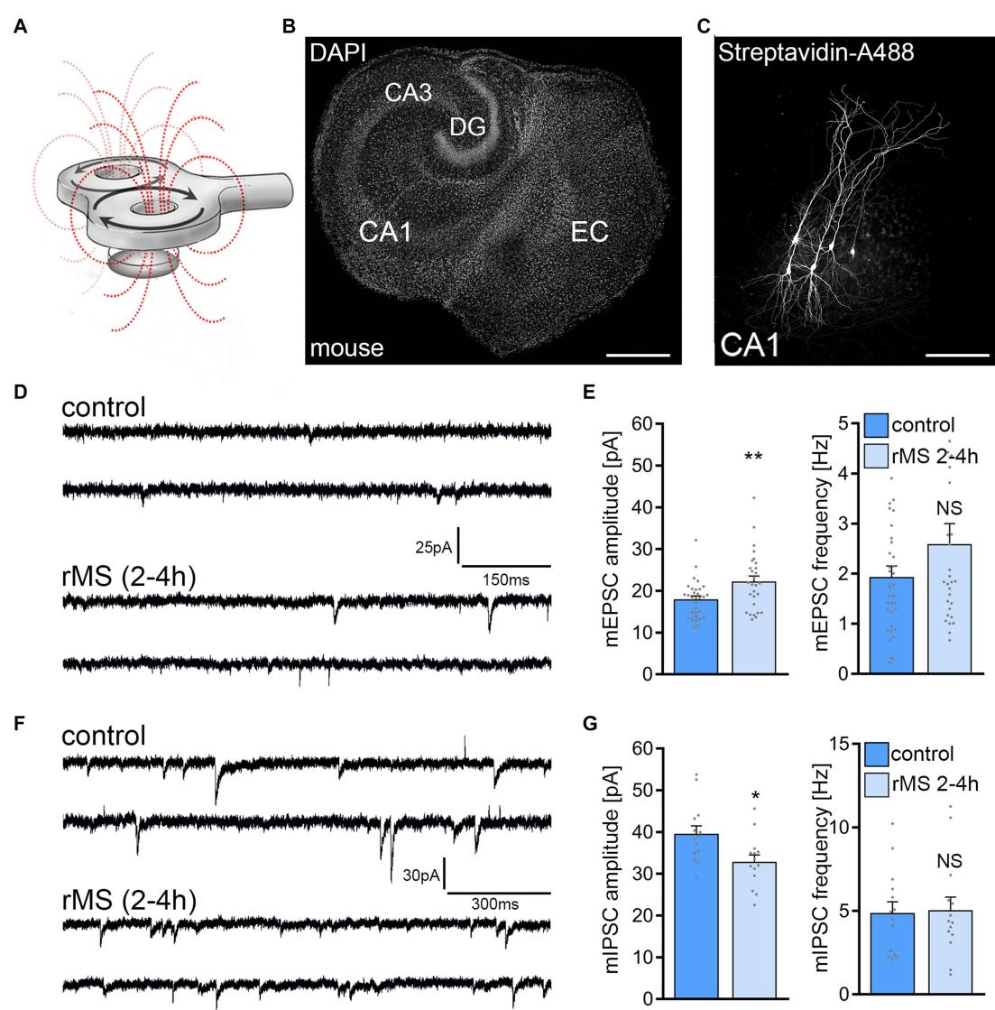 repetitive magnetic stimulation (rMS) induces synaptic plasticity in mouse CA1 pyramidal neurons. (A) Schematic illustration of the experimental setting. Organotypic tissue cultures are stimulated in a standard petri dish filled with extracellular solution using a figure-of-eight coil (900 pulses, , at maximum stimulator output). (B) Overview of an organotypic tissue culture. Visualization of cytoarchitecture with DAPI. DG, Dentate gyrus; EC, entorhinal cortex; CA1 and CA3, Cornu Ammonis areas 1 and 3. Scale bar, . © Patched CA1 pyramidal neurons filled with biocytin and identified post hoc with streptavidin-A488. Scale bar, . (D,E) Sample traces and group data of AMPA receptor-mediated miniature excitatory postsynaptic currents (mEPSCs) recorded from mouse CA1 pyramidal neurons in sham-(control) and -stimulated cultures 2–4 h after stimulation (control, cells; rMS, cells; Mann–Whitney test). (F,G) Sample traces and group data of GABA receptor-mediated miniature inhibitory postsynaptic currents (mIPSCs) recorded from mouse CA1 pyramidal neurons in sham-(control) and -stimulated cultures 2–4 h after stimulation (control, cells; cells; Mann–Whitney test). Individual data points are indicated in this and the following figures by gray dots. Data are mean SEM. NS, not significant. .