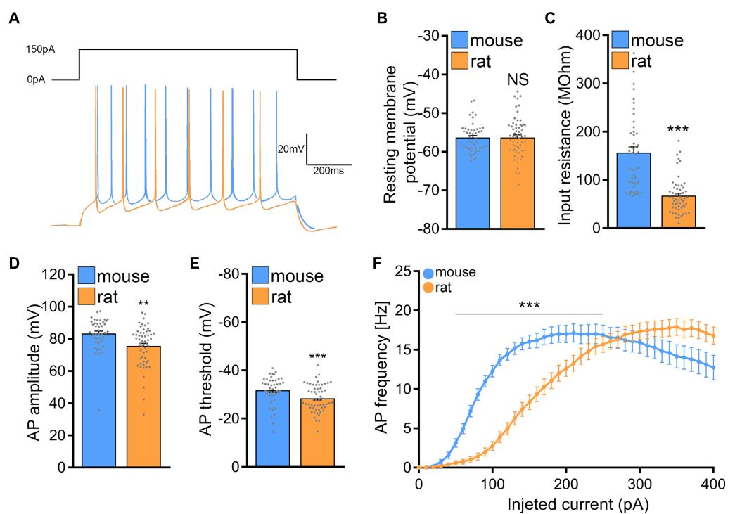 FIGURE 7 Rat CA1 pyramidal neurons exhibit lower excitability in comparison to mice. (A) Sample traces from input–output recordings of CA1 pyramidal neurons of mouse and rat tissue cultures. (B,C) Group data of resting membrane potentials and input resistances from mouse and rat CA1 pyramidal neurons (mouse, cells; rat, cells; Mann–Whitney test). (D,E) Group data of action potential (AP) amplitude and threshold from mouse and rat CA1 pyramidal neurons (mouse, cells; rat, cells; Mann–Whitney test). (F) Current/frequency curve of CA1 pyramidal neurons of mouse and rat tissue cultures (mouse, cells; rat, cells; 2-way ANOVA). Data are mean SEM. NS, not significant. . .