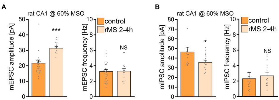 Subsequently, we tested whether a stimulation protocol applied at a higher intensity would induce plasticity in rat CA1 pyramidal neurons. Indeed, when rat tissue cultures were stimulated with at MSO a robust increase in the mean mEPSC amplitude was detected (Figure 8A), similar to what we observe in the mouse cultures stimulated at MSO (cf., Figures 1E). In addition, a significant reduction in mean mIPSC amplitude was evident after rMS stimulation at MSO in a different set of rat tissue cultures (Figure 8B; c.f., Figure 1G). These results demonstrate that rat CA1 pyramidal neurons do express rMS-induced plasticity, but require a higher stimulation intensity for rMS-induced potentiation of excitatory synapses and depression of inhibition to occur.