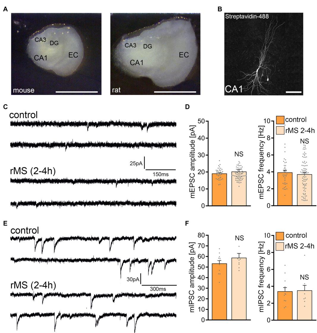 repetitive magnetic stimulation (rMS) at maximum stimulator output fails to induce synaptic plasticity in rat CA1 pyramidal neurons. (A) Overview images of a mouse and rat organotypic tissue culture. DG, Dentate gyrus; EC, entorhinal cortex; CA1 and CA3, Cornu Ammonis areas 1 and 3. Scale bar, . (B) Patched rat CA1 pyramidal neuron filled with biocytin and identified post hoc with streptavidin-A488. Scale bar, . (C,D) Sample traces and group data of AMPA receptor-mediated miniature excitatory postsynaptic currents (mEPSCs) recorded from rat CA1 pyramidal neurons in sham-(control) and -stimulated cultures 2–4 h after stimulation (control, cells; rMS, cells; Mann–Whitney test). (E,F) Sample traces and group data of GABA receptor-mediated miniature inhibitory postsynaptic currents (mIPSCs) recorded from rat CA1 pyramidal neurons in sham-(control) and -stimulated cultures 2–4 h after stimulation (control, cells; rMS, cells; Mann–Whitney test). Data are mean SEM. NS, Not significant.
