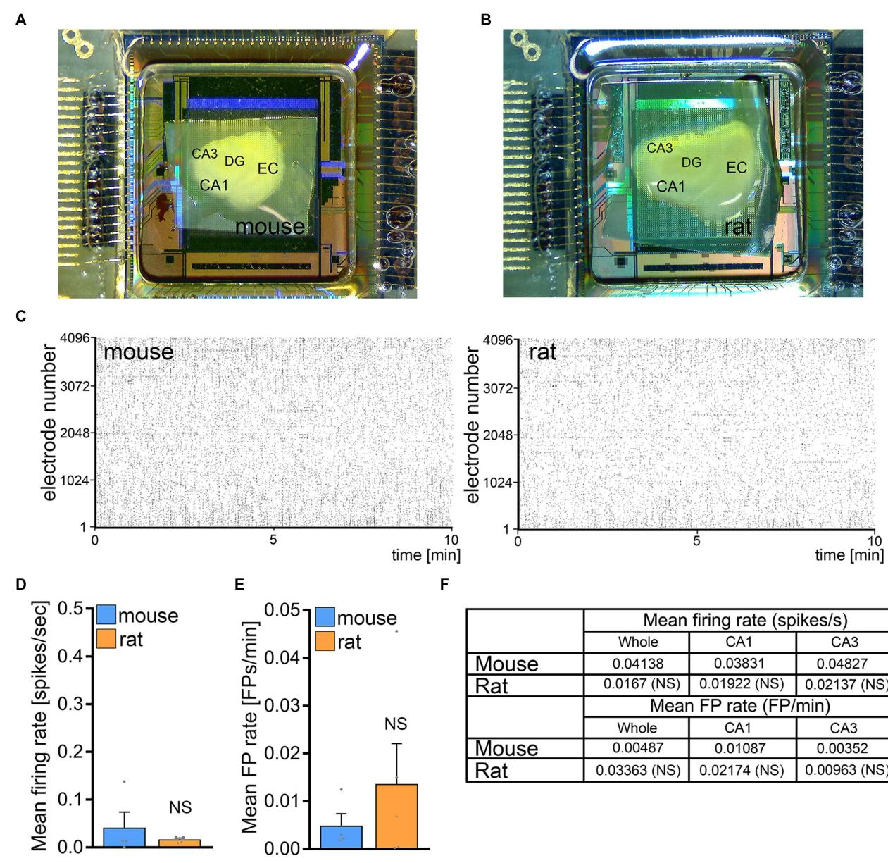 FIGURE 4 No significant differences in baseline network activity in mouse and rat tissue cultures. (A,B) Overview images of mouse and rat tissue culture on highdensity microelectrode array chips. DG, dentate gyrus; EC, entorhinal cortex; CA1 and CA3, Cornu Ammonis areas 1 and 3. © Raster plots of spikes during recording period in mouse and rat tissue cultures. (D–F) Group data of mean firing rate and mean field potential rate from mouse and rat tissue cultures (mouse, cultures; rat, cultures; Mann–Whitney test). Data are mean SEM. NS, not significant.