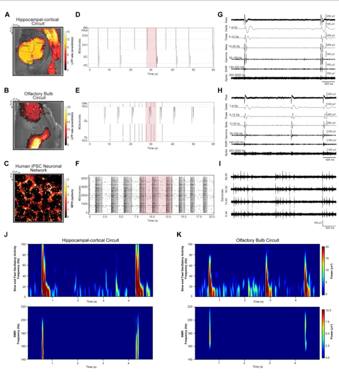 To quantify network-wide LFP and spike events that emerged from dynamical neuronal ensembles, we investigated synchronous large-scale firing patterns in HC and OB circuits and human iPSC networks. Recorded brain slice circuits from step 3.2 and recorded iPSC networks from step 3.3 were analyzed according to steps 4.1-4.2 of the protocol. First, event detection and denoising were performed for all recorded datasets and regionally resolved according to circuit specifications. Next, topographical pseudo-color spatial mapping of mean large-scale LFP and spike firing patterns, rastergrams of detected events, and representative 5-s traces of filtered waveforms were plotted (Figures 3A-I). Topographical pseudo-color mapping of large-scale LFP and spike firing rate patterns were overlaid on the respective microscope-captured optical images of HC (Figure 3A), OB (Figure 3B), and human iPSC neuronal network (Figure 3C). This allows the investigation of individual circuit and network-based oscillatory patterns and responses. HC and OB rastergrams contain detected LFP event counts sorted over the DG, Hilus, CA3, CA1, EC, and PC layers of the HC circuit and ONL, OCx, GL, PL, and GCL layers of the OB network over a 60-s time bin (Figures 3D,E). The human iPSC rastergram displays synchronous detected spike events of the interconnected cultured network over a time bin (Figure 3G). Next, 5s representative event traces from large-scale HD-MEA recording sites show a range of recorded oscillatory frequencies in the HC (i.e., selected electrode in CA3) (Figure 3G) and OB (i.e., selected electrode in GL) (Figure 3H) circuits and multiunit spike bursting activity in the human iPSC network from four selected active electrodes in the array (Figure 3I). These exemplary signals show biosignal signatures, including low-frequency LFP oscillations with bandpass filtered δ, θ, β, and γ frequency bands; sharp wave ripples (SWR) (140-220 Hz); and high-frequency single and MUA (300-3500 Hz). Finally, power spectral density (PSD) analysis was employed to simultaneously quantify a specific oscillatory band’s power magnitude in the interconnected HC and OB circuit recorded from HD-MEA (Figures 3J,K).
