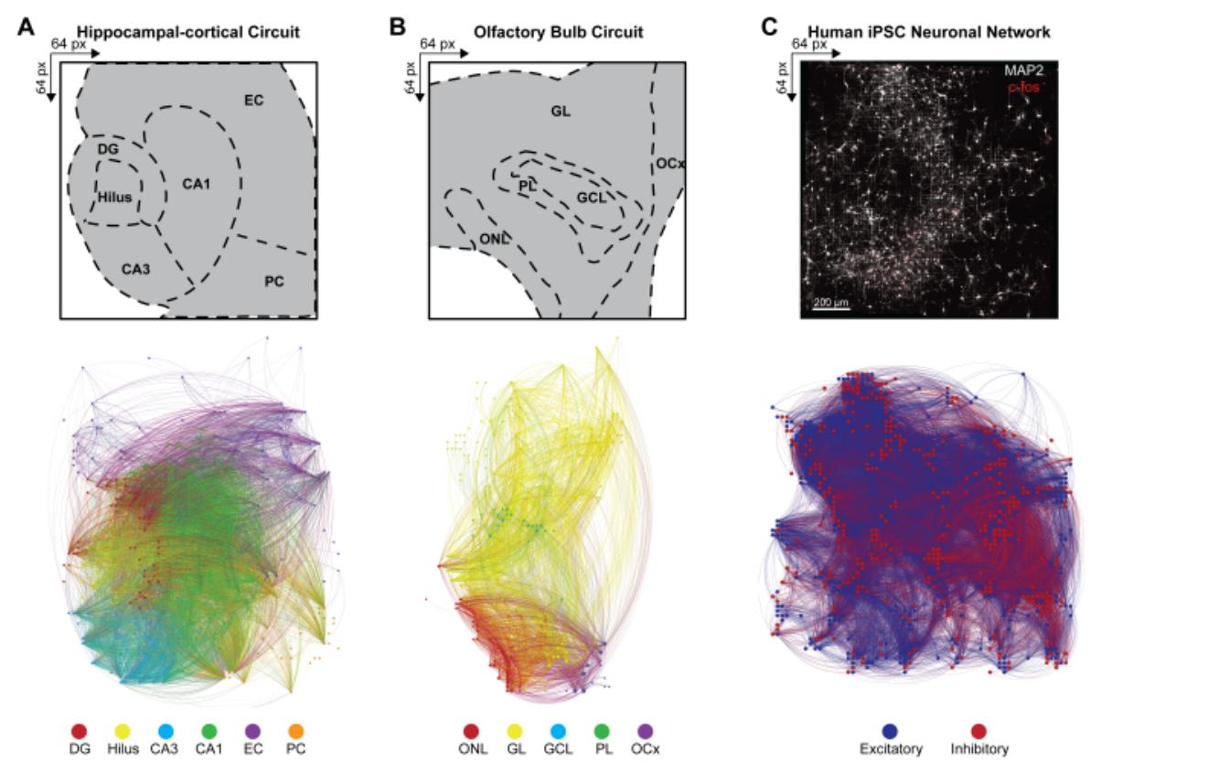 Figure 4: Organization of multimodal network-wide functional connectomes. (A-C) Gephi maps illustrating nodal functional connectivity, where nodes correspond to one of the example color bar legends (below), while the links (or edges) are shaded to match the connecting nodes. Example legends for (A) HC, (B) OB, and © iPSC layers are displayed on a 64 array. HC and OB layers are plotted over a 100-s time bin to effectively reduce the number of visible nodes and links for visualization purposes. Please click here to view a larger version of this figure.