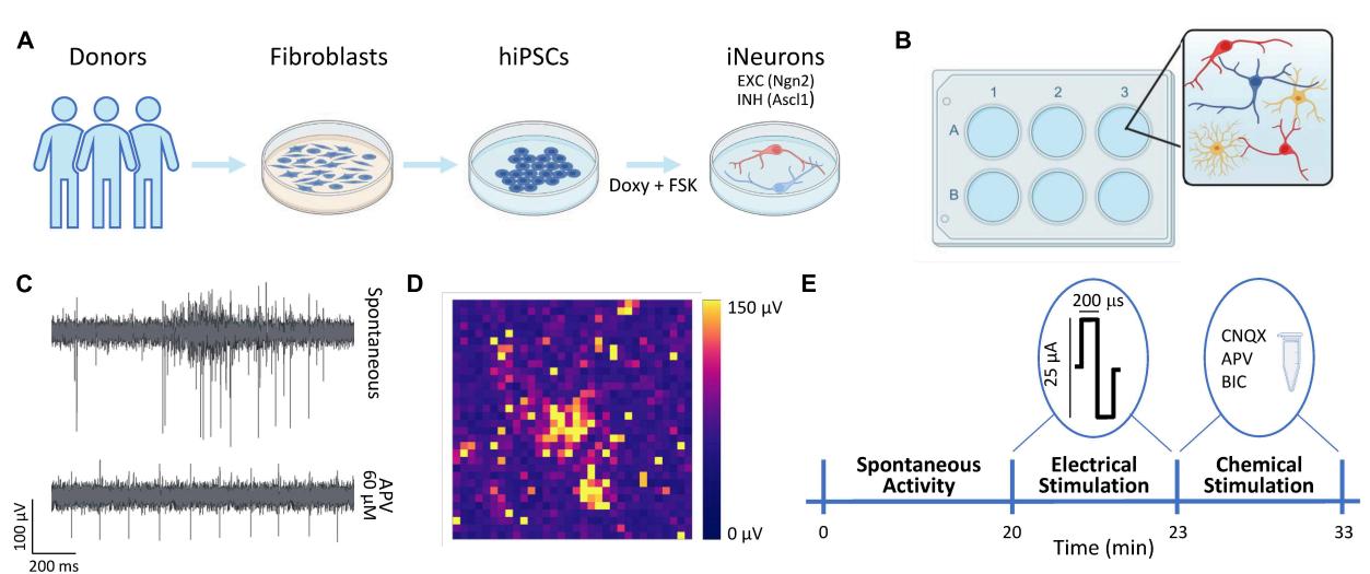 FIGURE 1 Overview of the experimental protocol. (A) Schematic representation of the neuronal cultures protocol. The hiPSCs were derived thanks to a reprogramming protocol applied to fibroblasts obtained from donors’ skin biopsies. The hiPSCs were induced to differentiate into excitatory (EXC, red) and inhibitory (INH, blue) neurons by adding doxycycline and forskolin (FSK) compounds to the culture medium. (B) The neurons (N, in red and blue) were moved to the 3Brain devices and mixed with rat astrocytes (As, in yellow) at the proportion equal to N:As 70:30. © Representative electrophysiological trace from a single electrode during spontaneous activity (top) and after the administration of APV (bottom). (D) Color map depicting the amplitude (in of the electrophysiological activity of a representative neuronal network. Each pixel represents one channel. (E) Schematic representation of the experimental protocol. The spontaneous neuronal activity was recorder for . Subsequently, a 3-min stimulation train composed of 20 biphasic stimuli (at 0.1 Hz frequency) was emitted. Finally, a chemical stimulation was performed by adding either Bicuculine (BIC, or D-2-Amino-5-phosphonopentanoic acid (D-APV, or 6-cyano-7-nitroquinoxaline-2,3-dione (CNQX, t o the medium and by recording for the neuronal activity after the drug administration.