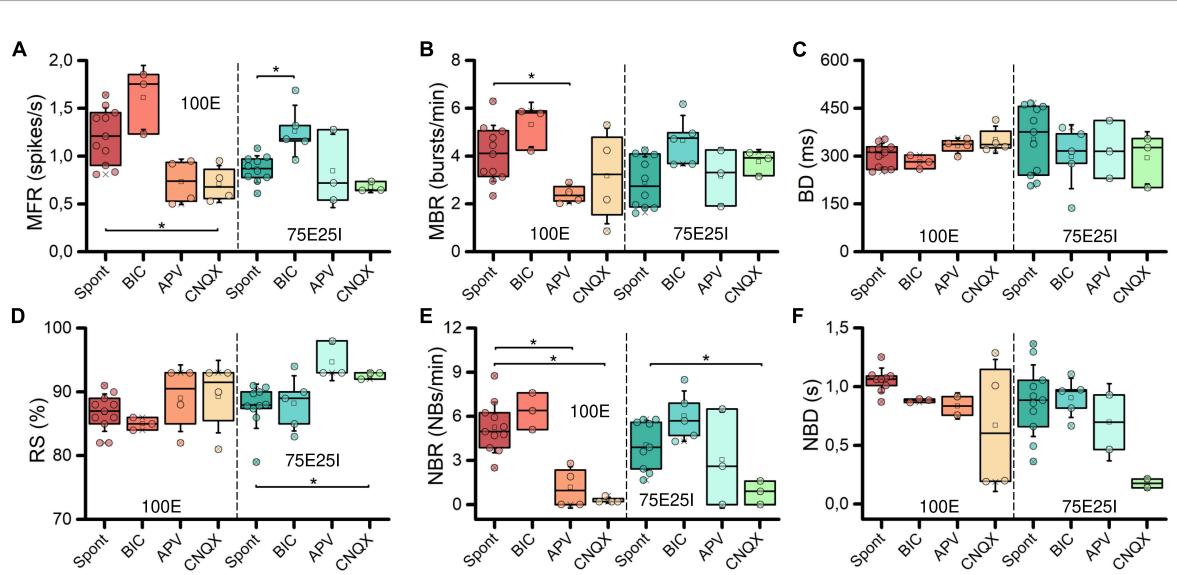 To further explore the dynamics of our neuronal networks’ configurations (i.e., the 100E and the mixed 75E25I), we analyzed the responses triggered by chemical stimulation. By using CNQX (, ) and APV (, ), which are blockers of AMPA and NMDA receptors, respectively, we observed a significant reduction in firing and network bursting activity in both configurations (Figure 4A). However, upon an initial qualitative assessment, it appeared that BIC did not produce noticeable changes with respect to the spontaneous activity , , Figure 4A). To precisely determine the extent to which these drugs influenced neuronal activity, we computed the distribution of firing patterns for both configurations (Figure 4B). After the administration of BIC, the 100E neuronal networks exhibited a similar pattern to the distribution of spontaneous firing. The 75E25I did not show great differences, except for a small shift in the peak (from the second to the first bin) and a slight increase in the bins associated with higher firing rates. A noticeable shift toward lower firing rates is evident for both configurations upon administration of CNQX and APV. This shift is characterized by a distinct peak in the range of MFR values between 0 and 0.4 spikes/s. In quantitative terms, the MFR (Figure 5A and Supplementary Tables 5, 7) showed lower values with respect to the spontaneous activity upon administration of CNQX for both configurations (Supplementary Tables 6, 8). Similarly, the APV caused a decreasing in the firing activity, despite not showing statistical differences with respect to the spontaneous condition (Supplementary Tables 6, 8). On the other hand, BIC significantly increased the firing rate in the 75E25I configuration ). An analogous trend can be observed for the MBR (Figure 5B and Supplementary Tables 5, 7) of both configurations, while burst duration was not affected by the administration of the drugs (Figure 5C and Supplementary Tables 5, 7). Interestingly, the RS (Figure 5D and Supplementary Tables 5, 7) showed an increasing trend for both configurations when CNQX and APV were administered, indicating a dispersion of burst events within the neuronal networks. Indeed, the major significant differences arose with the network burst rate (NBR, Figure 5E and Supplementary Tables 5–8): CNQX and APV completely abolished the network burst events, leading to a NBR close to zero, especially upon CNQX administration. As a consequence, also the NBD was reduced (Figure 5F and Supplementary Tables 5, 7).
