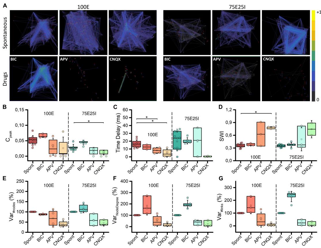 FIGURE 6 Topology and connectivity characterization. (A) Connectivity graphs of representative 100E (left) and 75E25I (right) neuronal cultures, during the spontaneous activity and after the administrations of drugs, i.e., CNQX, APV and BIC (from left to right). Each node is represented by dots (red: sender node, blue: receiver node, gray: broker node) and functional connections are represented with edges. Box plots of: (B) Maximum of the cross-correlogram © Time Delay; (D) Swall World Index (SWI); (E) Number of Nodes; (F) Node degree; (G) Number of Links. In the box plots, data are represented with the percentile 25th–75th (box), the standard deviation (whiskers), the median (line), the mean (square), and the minimum and maximum (crosses) values. Raw data points are represented with circles over each box plot (* refers to adjusted with Bonferroni’s correction).