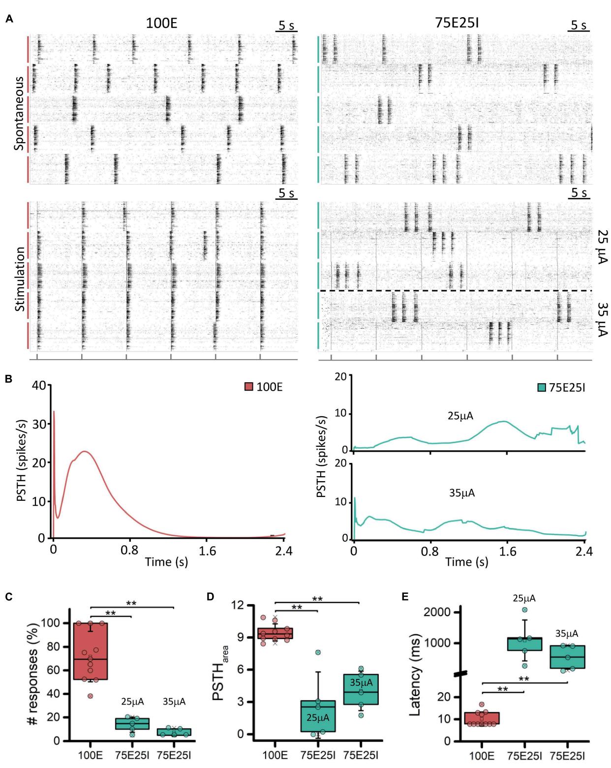 In order to better characterize our experimental models and to test their responsiveness to electrical stimulation, we applied current stimuli with different current amplitudes. Observing the raster plots in Figure 3A, the effect of electrical stimulation on the networks can be qualitatively appreciated. In particular, the 100E networks ) positively responded to all stimuli. Indeed, in the five recorded wells, the network activity was aligned at the emission of the stimulus, unlike the upper raster plot, where the cultures showed synchronous network events independently the one from the other during spontaneous activity. Regarding the 75E25I configuration $N = 1 0 $ ), the stimulation was not as effective as in the case of 100E, leaving the network activity almost unchanged without any evident synchronization with the emission of the stimuli even when using the highest current amplitude (i.e., ). Observing the PSTH (Figure 3B), the response of the 100E displayed a canonical shape, in which we appreciated an early response in the first ten of milliseconds characterized by a sharp peak. The early response was successively followed by a wide late response that ended around . Overall, the 100E PSTH outlined high recruitment and positive response from the network. On the other hand, the 75E25I showed an inconstant PSTH, characterized by an irregular shape of response, likely due to the baseline activity of the network itself, confirming what was qualitatively suggested the by raster plots, both at (on bottom) and (on top). The only appreciable difference was a hint of early and late response with the stimulation, although smaller than the one evoked in 100E networks. Regarding the quantification of the number of responses (Figure 3C and Supplementary Table 3), the 100E responded on average at the of the stimuli, therefore showing a good recruitment of the cultures. The latter observation was further confirmed by looking both at the 100E PSTH area (Figure 3D and Supplementary Table 3) and latency (Figure 3E and Supplementary Table 3). On the other hand, the 75E25I responded to the 13.83 and of the stimuli when stimulated with 25 and respectively, and no significant differences were observed between the used amplitude (Supplementary Table 4). However, stimulation elicited a slightly higher (Figure 3D and Supplementary Table 3) and shorter (Figure 3E and Supplementary Table 3) response than the .