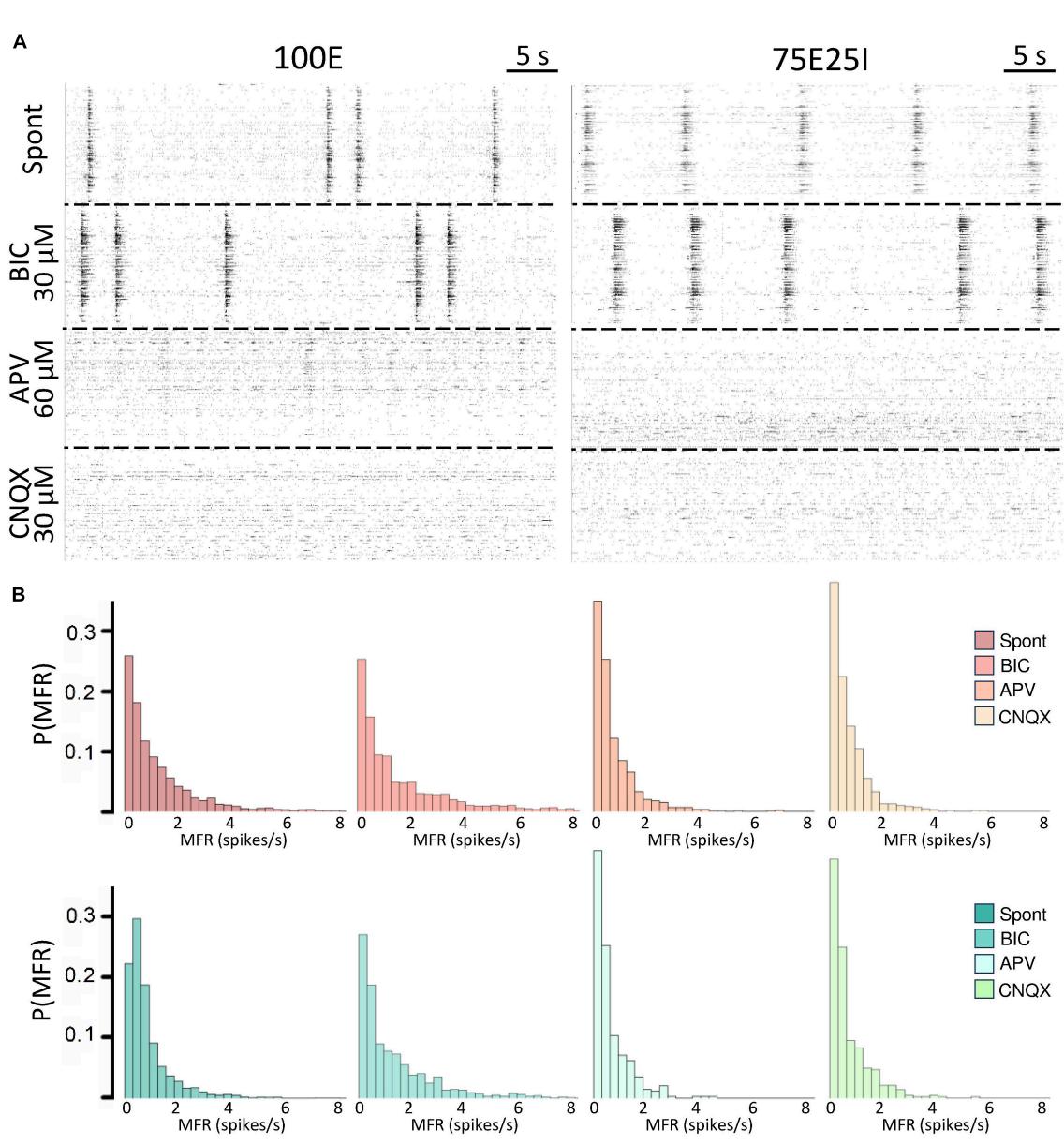 FIGURE 4 Qualitative evaluation of the neuronal activity after the drugs administration. (A) Raster plots of 60-s of the electrophysiological activity of the same representative 100E (left) and 75E25I (right) neuronal network, after the drug administration of BIC, APV and CNQX. Each spike is represented with a small black bar. (B) Distribution of the MFR of 100E (top) and 75E25I (bottom) neuronal cultures, during spontaneous activity and after the administrations of the drugs.