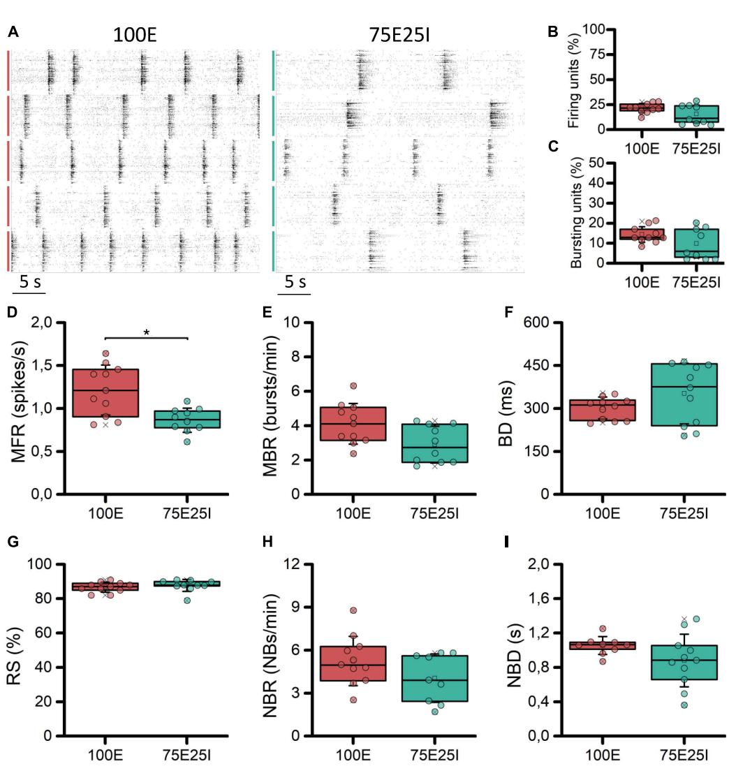 FIGURE 3 Characterization of the spontaneous electrophysiological activity. (A) Raster plots of 5-representative neuronal cultures of 100E (left) and 75E25I (right) configurations. Each spike is represented with a small black bar, while the bigger vertical lines indicate separate wells (red lines for the 100E, green lines for the 75E25I). Box plots of: (B) Active units: percentage of electrodes with a firing rate (MFR) greater than 0.1 spikes/s; © percentage of electrodes with a bursting rate (MBR) greater than 0.4 bursts/min; (D) Mean Firing Rate (MFR); (E) Mean Burst Rate (MBR); (F) Burst Duration (BD); (G) Percentage of random spikes (RS); (H) Network Burst Rate (NBR); and (I) Network Burst Duration (NBD) for the 100E (in red) and 75E25I (in green) configurations. In the box plots, data are represented with the 25th–75th percentile (box), the standard deviation (whiskers), the median (line), the mean (square), and the minimum and maximum (crosses) values. Raw data points are represented with circles over each box plot (* refers to adjusted with Bonferroni’s correction).