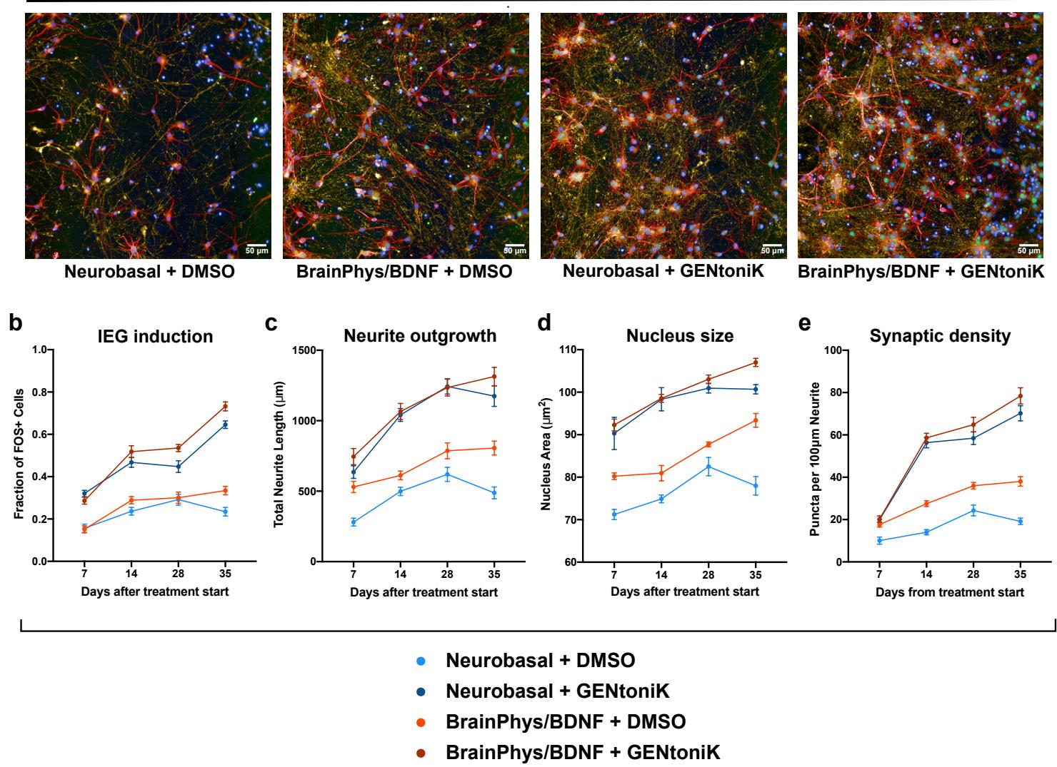 Supplementary Figure 9 | GENtoniK improves upon and complements alternative neuron maturation strategies. a, Immunofluorescent stain for MAP2, FOS, and SYN1 of day 35 hPSC-derived cortical neurons in plain Neurobasal medium, BrainPhys medium+BDNF, Neurobasal with GENtoniK, and BrainPhys BDNF with GENtoniK. b-e, Time-course quantification of the maturity parameters: FOS induction by KCl (b), neurite length ©, nucleus size (d), and SYN1 puncta density (e) in neurons that received GENtoniK versus DMSO from day 7 from plating. Plates were collected for analysis every 7 days, beginning 7 days after the start of DMSO/GENtoniK treatment. microplate wells. Error bars represent S.E.M. Scale bars are .