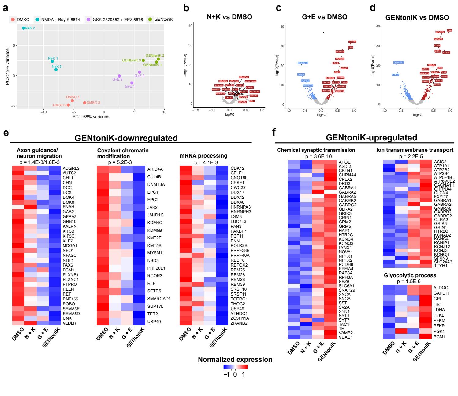 Supplementary Figure 5 | RNA-seq results of day 21 neurons treated with maturation promoting small molecules from d7-14. a, Principal component analysis of RNA-seq results from neurons treated with DMSO, two epigenetic drugs , two calcium influx driving compounds , or complete GENtoniK. b-d, Volcano plots of RNA-seq differential expression analysis vs DMSO of calcium influx agonist NMDA and Bay K 8644 (b), epigenetic drugs GSK-2879552 and EPZ-5676 ©, or complete GENtoniK (d). e,f, Heatmaps of genes within overrepresented biological process ontology categories among GENtoniK-downregulated (e), and upregulated (f) genes. RNA-seq results from 3 biological replicates. Heatmaps show expression normalized by row, calculated from mean TPM values. Displayed p-values are for enrichment of stated gene ontology categories among differentially expressed transcripts.