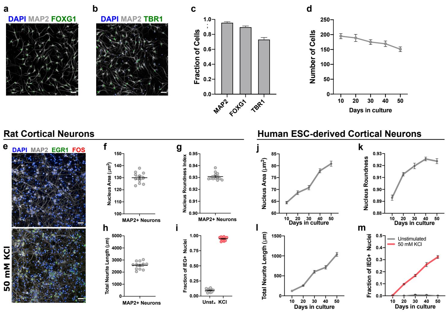 To benchmark the assay performance in mature cells, we employed primary embryonic rat cortical neurons, which quickly and reliably develop mature-like functionality in vitro20. At 14 days after plating, rat neurons displayed large and round nuclei ( , 0.93 roundness index), extensive neurite growth neuron), and near of the neurons showed KCl-induced IEG responses (Supp. Fig. 1e-i). In contrast, in human PSC-derived cortical neurons, these properties only very gradually increased over a 50-day culture period and never reached the maturity of their rodent counterparts (Supp. Fig. 1j-m). These results indicate that our multi-phenotypic assay reliably captures the maturation of developing rat and human PSCderived human cortical neurons.