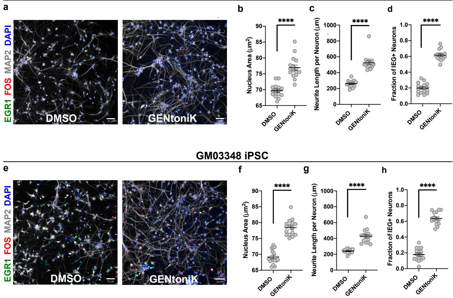 Supplementary Figure 8 | GENtoniK promotes maturation of cortical neurons derived from induced pluripotent stem cells (iPSCs). a-d, Neurons derived from reprogrammed normal lung fibroblast line MRC5 microplate wells): representative high-content maturation assay images (a), and quantification of maturation parameters nucleus size (b), neurite length © and IEG induction by KCl (d). e-h, Neurons derived from reprogrammed skin fibroblasts of 10-year-old male microplate wells): representative high-content maturation assay images (e), and quantification of maturation parameters nucleus size (f), neurite length and IEG induction by KCl (h). Two-tailed Welch’s -test; asterisks indicate statistical significance. Mean values are represented by a black line. Error bars represent S.E.M. Scale bars are .