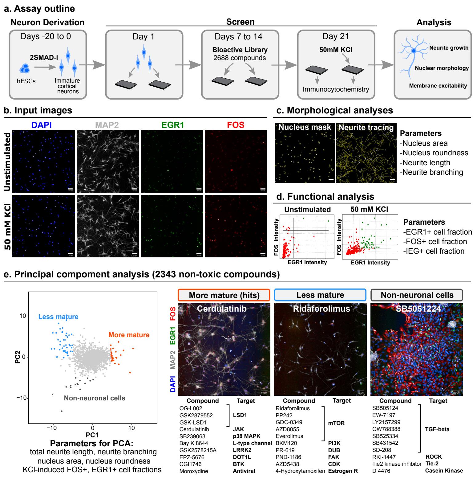 Fig. 1 | High-content chemical screen for drivers of neuron maturation. a, Outline of screening protocol in hPSC-derived excitatory cortical neurons. 2SMAD-i, dual SMAD inhibition. b, Example of input immunofluorescent images. Top: unstimulated neurons at day 21 post plating. Bottom, neurons received of KCl 2 hours before fixation. c, automated analysis of neuron morphology. Left, nuclei detection mask from DAPI channel. Right, automated neurite tracing from MAP2 channel. d, Quantification of neuron excitability by applying an intensity threshold to FOS and EGR1 channels within the nuclear mask. e, Principal component analysis of screened compound library computed from 6 maturity parameters (zscores averaged from independent screen runs). Left, PCA plot of 2343 non-toxic library compounds (out of 2688 total compounds tested) with phenotypic clustering of maturation enhancing (orange), maturation inhibiting (blue), and non-neuronal proliferation enhancing (grey) compounds. Right, representative screen images and 10 representative hit compounds within each cluster. Scale bars are 50 .