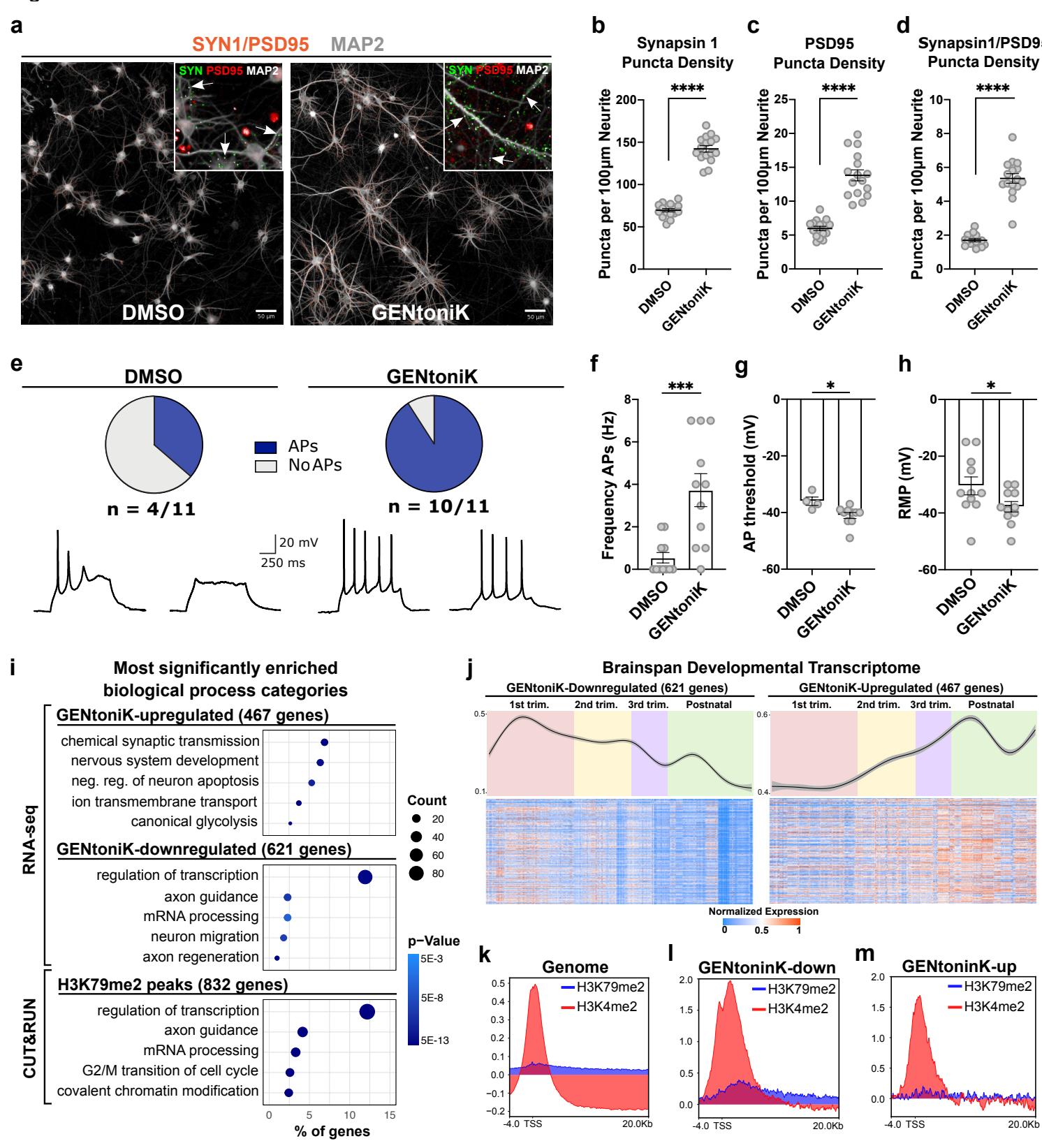 Fig. 3 | Validation of small molecule maturation strategy with orthogonal readouts. a, Representative images for synaptic marker detection in day 35 hPSC-derived cortical neurons that received DMSO versus GENtoniK treatment from days 7 to 21. Orange dots represent instances of SYN1 and PSD95 apposition. Inset, input immunofluorescent images used for quantification, with examples of pre- and post-synaptic marker apposition highlighted by arrows. b-d, GENtoniK increases density of SYN1, PSD-95, and their apposition expressed as punctate per neurite length wells from independent experiments). eh, GENtoniK promotes excitability and mature resting properties in day 28 hPSC-cortical neurons. e, of treated neurons fired evoked action potentials in contrast to of DMSO controls. Traces show representative responses for each group. f-h, Quantification of electrophysiology parameter AP frequency (f), AP threshold (g), and resting membrane potential (h) neurons per group from 4-6 dishes and 3 independent experiments). i-m, RNA-seq and CUT&RUN (3 biological replicates) reveal that GENtoniK induces shift from immature to mature transcriptional programs. i, Gene ontology analysis showing enrichment for mature neuron function in genes upregulated by the cocktail; and enrichment for immature function and transcriptional regulation in genes downregulated by the cocktail or occupied by DOT1Ltarget H3K79 2-methylation. j, In the BrainSpan Atlas of the Developing Human Brain (https://www.brainspan.org), genes downregulated by GENtoniK display higher average expression during early development and decrease over time (left), genes upregulated by GENtoniK display an average expression that increases from early development to gestation and after birth (right). Top panels show smoothed means curves with confidence intervals, bottom panels show heatmaps of normalized expression , CUT&RUN peak profiles of LSD1 and DOT1L targets H3K4 and H3K79 2-methylation in immature, untreated d7 hPSC-cortical neurons across the whole genome and in genes downregulated (l) or upregulated by GENtoniK in RNA-seq. b-d and f-h, Two-tailed Welch’s -test; asterisks indicate statistical significance. Mean values are represented by a black line (b-d) or a bar graph (f-h). Error bars represent S.E.M. Scale bars are .