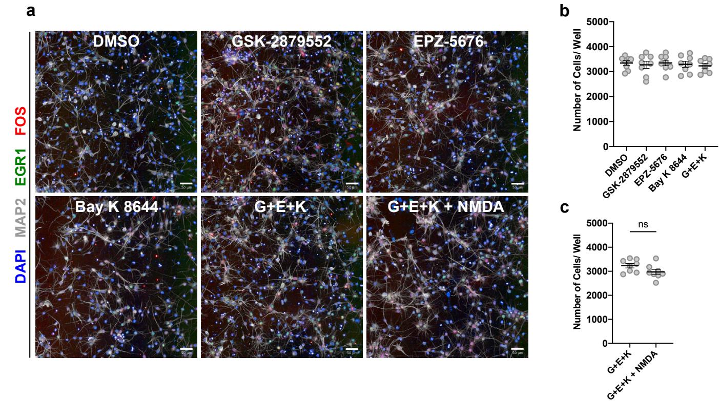 Supplementary Figure 4 | Maturation-promoting small molecules do not significantly affect neuron survival. a, Representative staining images from hit combination experiments (Fig. 2c-e), showing day 21 neurons that received the specified treatment from days 7-14. b, Quantification of number of cells per well in neurons treated with screen hits GSK-2879552, EPZ-5676, Bay K 8644, and a combination of the 3 ) c, Quantification of number of cells per well in neurons treated with 3-hit drug combination ) and the same with the addition of NMDA. microplate wells from 2 independent experiments. Error bars represent S.E.M. Scale bars are .