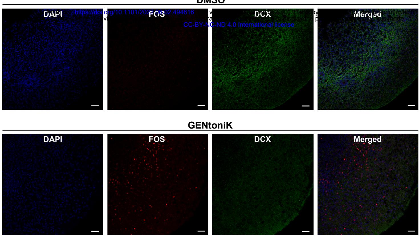 Supplementary Figure 10 | GENtoniK decreases migratory marker expression and increases neuronal activity marker expression in forebrain organoids. a, Representative images of immunofluorescent staining for FOS, DCX, and MAP2 in day 60 forebrain organoids that received DMSO (top) or GENtoniK (bottom) from days 15 to 50. Scale bars are .