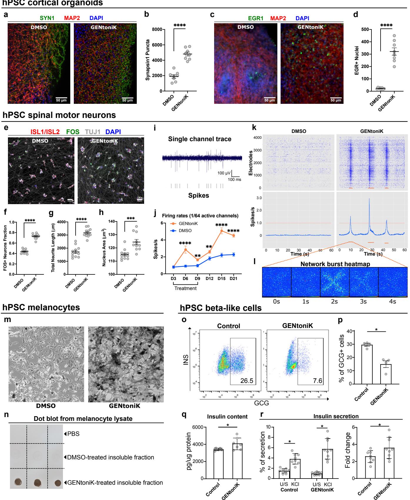 Fig. 4 | Validation of maturation strategy across neuronal and non-neuronal hPSC-derived cells. ad, GENtoniK treatment induces synaptogenesis and spontaneous activity in cortical organoids. a, Representative images of immunofluorescent staining for SYN1 and MAP2 in day 60 organoids. b, Quantification of total SYN1 puncta per field cryosections randomly sampled from organoids). c, Representative images of immunofluorescence staining for EGR1 and MAP2 in unstimulated day 60 organoids. d, Quantification of cells per field cryosections randomly sampled from organoids). e-h, GENtoniK promotes maturation of hPSC-derived spinal motor neurons. e, Representative high-content maturation assay images of spinal motor neurons (day 40 of hPSC differentiation). fh, Quantification showing GENtoniK-improved KCl-induction of cells (f), total neurite length (g), and nucleus area (h) in SMNs microplate wells from 2 independent differentiations). i-l, GENtoniK treatment increases firing rates and induces spontaneous bursting activity on SMNs plated on high-density multielectrode arrays. i, Sample single channel trace of GENtoniK-treated SMNs illustrating spike detection. j, Time-course analysis of average firing rates in SMNs plated on HD-MEAs, calculated from 60 s of activity in the 1/64 most active electrodes electrodes from 2 MEA probes). k, Representative 60-second spike rastergrams (top) and average firing rates (bottom) of SMNs plated on a HD-MEAs. Only GENtoniK-treated SMNs displayed spontaneous bursting events (orange bars). l, Whole array heatmap of a 4-second bursting event. m-n, GENtoniK treatment induces early pigmentation in hPSCmelanocytes. m, Brightfield images of melanocytes (day 33 of hPSC differentiation) that received GENtoniK or DMSO from day 11. n, Dot blot analysis of PBS or cell extract of melanocytes treated with GENtoniK or DMSO biological replicates). o-r, GENtoniK promotes maturation of hESC-derived beta-like cells. Representative flow cytometry analysis (o) and quantification of the percentage of cells in INS-GFP+ cells after 7 days treatment with GENtoniK or control followed by 2 days treatment-free biological replicates). , Total insulin content of INS-GFP+ cells after 7 days treatment with GENtoniK or control followed by 2 days treatment-free biological replicates). r, Static KClstimulated human insulin secretion and fold change in beta-like cells after 7 days treatment with GENtoniK or control followed by 2 days treatment-free. The assay was performed in the presence of D-glucose biological replicates). b, d, f-h, j and p-r, Two-tailed Welch’s -test; asterisks indicate statistical significance. Mean values are represented by a black line (b, d, f-h) or a bar graph (p-r). Error represent S.E.M. Scale bars are .