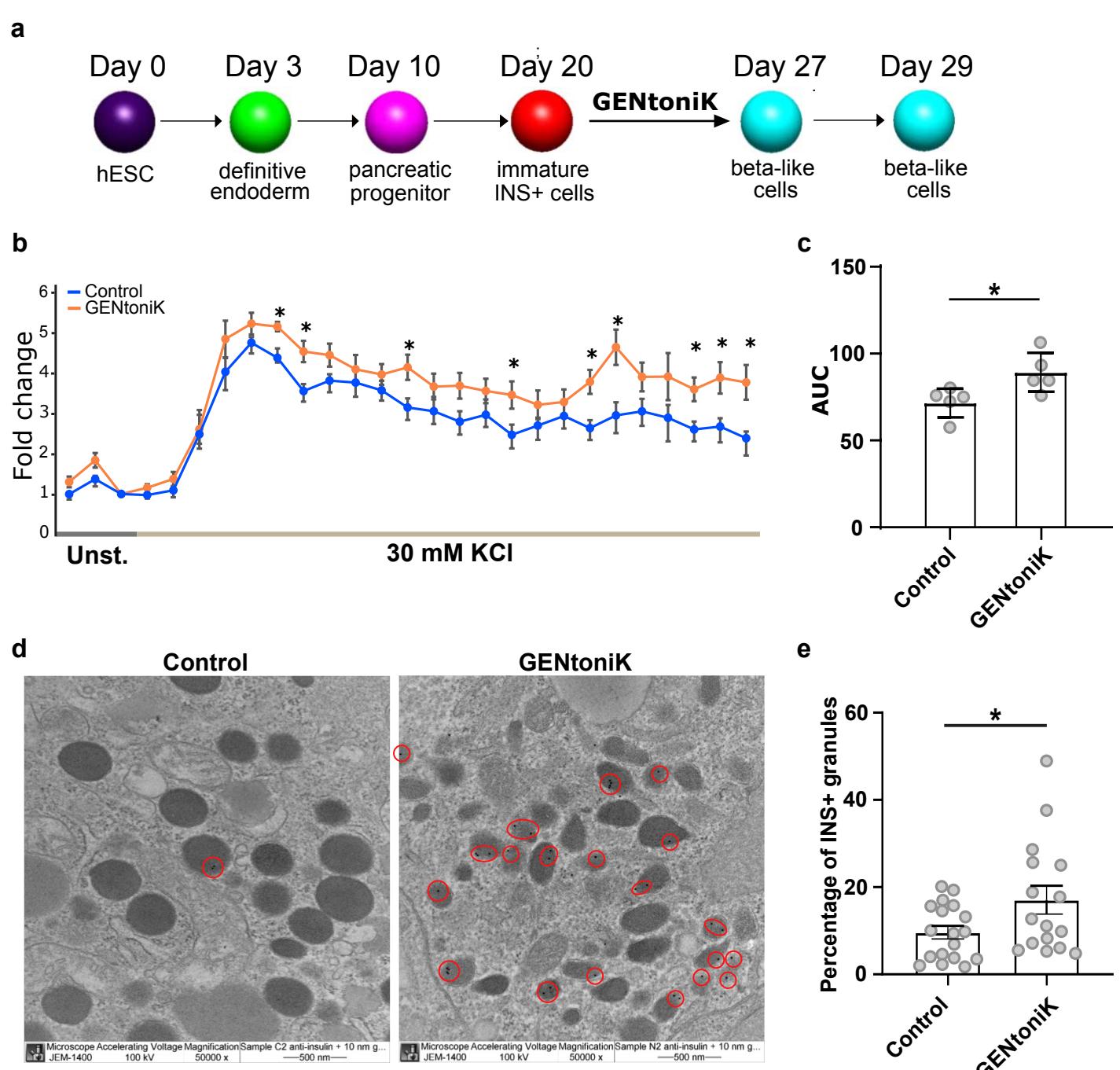 Supplementary Figure 11 | GENtoniK increases dynamic insulin secretion and insulin granules in hPSC-derived beta-like cells. a, Schematic representation of the stepwise differentiation protocol. hESCderived immature beta-like cells were treated with GENtoniK or DMSO from days 20 to 27. b,c, Dynamic KCl stimulated human insulin secretion (b) and area under curve (AUC, c) in hESC derived cells after 7 days treatment with GENtoniK or control followed by 2 days treatment-free culture. The assay was performed in the presence of D-glucose. Fold change was calculated by dividing the amount of secreted insulin at each time point by the average amount of secreted insulin at D-glucose. biological replicates. d, Representative electron micrographs showing immunogold labelling of insulin in beta-like cells. Circles indicate insulin+ granules ( gold particles). Magnification . e, Percentage of insulin+ granules in control and GENtoniK-treated beta-like cells . c and e, Twotailed Student’s -test; asterisks indicate statistical significance. Error bars represent S.E.M.