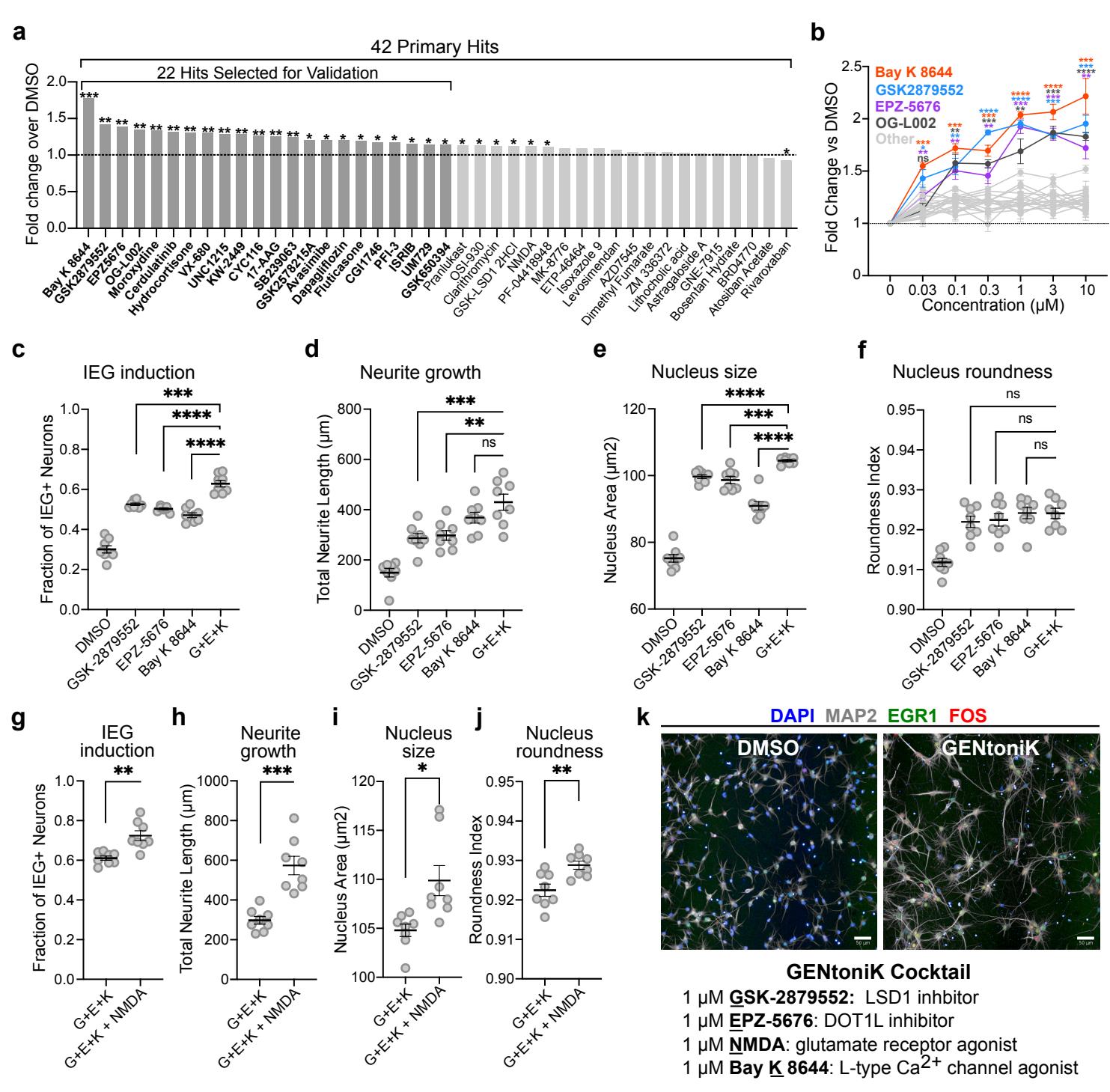 Fig. 2 | Validation and combination of screen hits identifies maturation-promoting cocktail GENtoniK. a, Ranking of primary hits by the mean of 4 maturity parameters (nucleus size and roundness, neurite length, and KCl-induced double FOS/EGR1+ cells) normalized to DMSO ( microplate wells). 22 top-ranked compounds were selected for validation. b, Dose-response validation of 22 screen hits comparing the mean of 4 maturity parameters normalized to DMSO microplate wells from 3 independent differentiation). c-f, Comparison of confirmed hits GSK-2879552, EPZ-5676, Bay K 8644, and a combination of the 3 ) across maturity parameters IEG induction ©, neurite growth (d), nucleus size (e), and nucleus area (f) microplate wells from 2 independent experiments). g-j, Comparison of 3-hit drug combination ) to the same with the addition of NMDA across maturity parameters IEG induction , neurite growth (h), nucleus size (i), and nucleus roundness (j) microplate wells from 2 independent differentiations). k, Top, representative images of cortical neurons treated with DMSO or maturation promoting cocktail GENtoniK. Bottom, formulation of GENtoniK. a-b, Brown-Forsythe and Welch ANOVA with Dunnett’s T3 multiple comparison test. c-j, Two-tailed Welch’s -test; asterisks indicate statistical significance. Mean values are represented by a bar graph (a) or a line (cj). Error bars represent S.E.M. Scale bars are .