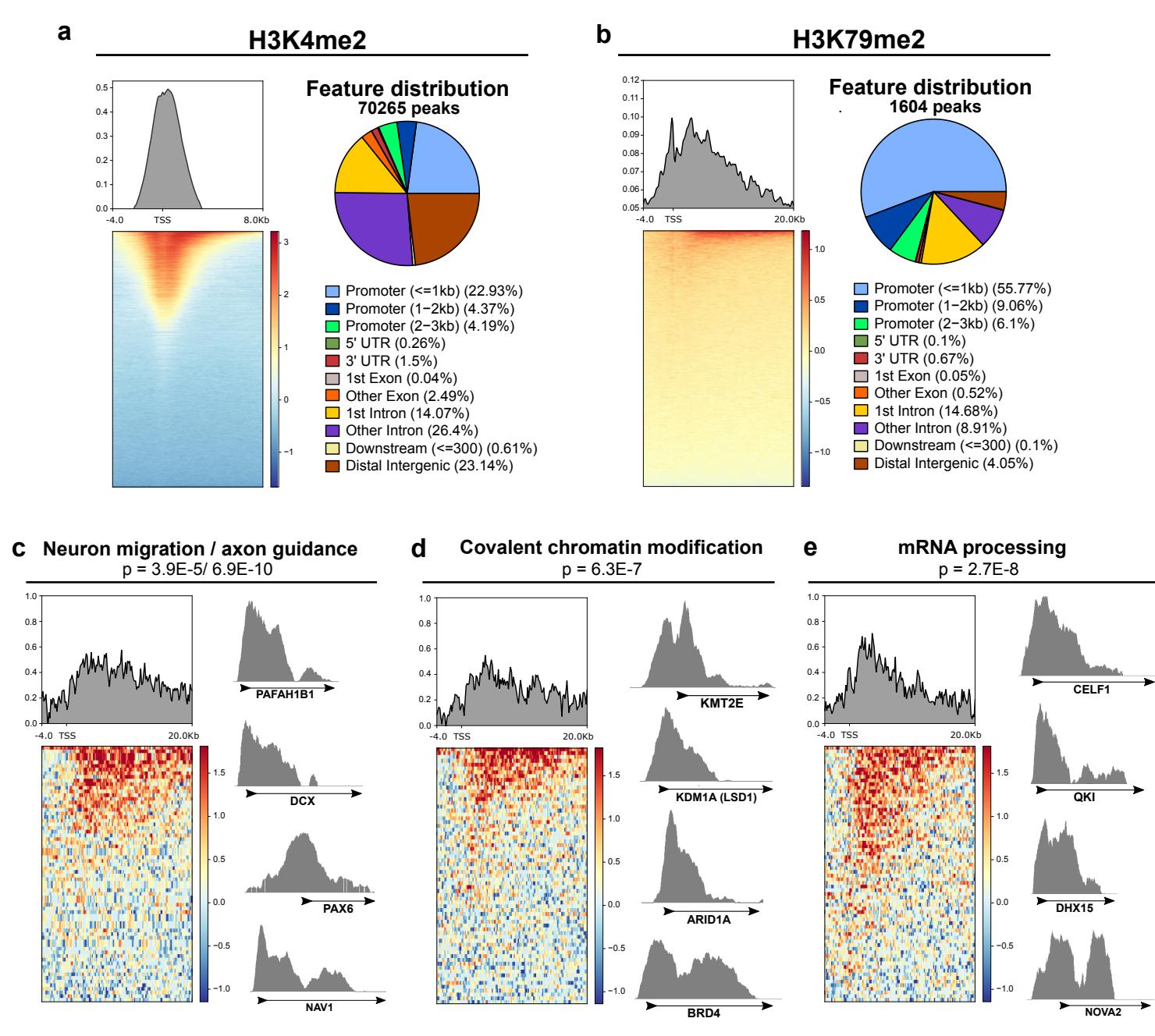 Supplementary Figure 7 | CUT&RUN analysis of LSD1 and DOT1L-targeted histone marks in untreated day 10 immature neurons. a, Left, normalized genome enrichment profile of H3K4me2 over IGG control along 12Kb region surrounding the transcription start site (TSS). Right, genome-wide distribution of gene features among H3K4me2 peaks. b, Left, normalized genome enrichment profile of H3K79me2 over IGG control along 24Kb region surrounding the transcription start site (TSS). Right, genome-wide distribution of gene features among H3K79me2 peaks. c-e, Enrichment of H3K79me2 vs IGG control in gene ontology categories significantly overrepresented among H3K79me2 peaks with representative tracks for genes within each category: GO:0001764-neuron migration and GO:0007411- axon guidance ©, GO:0016569-covalent chromatin modification (d), and GO:0006397-mRNA processing (e). Displayed p-values are for enrichment of stated ontology categories among genes within H3K79me2 peaks.