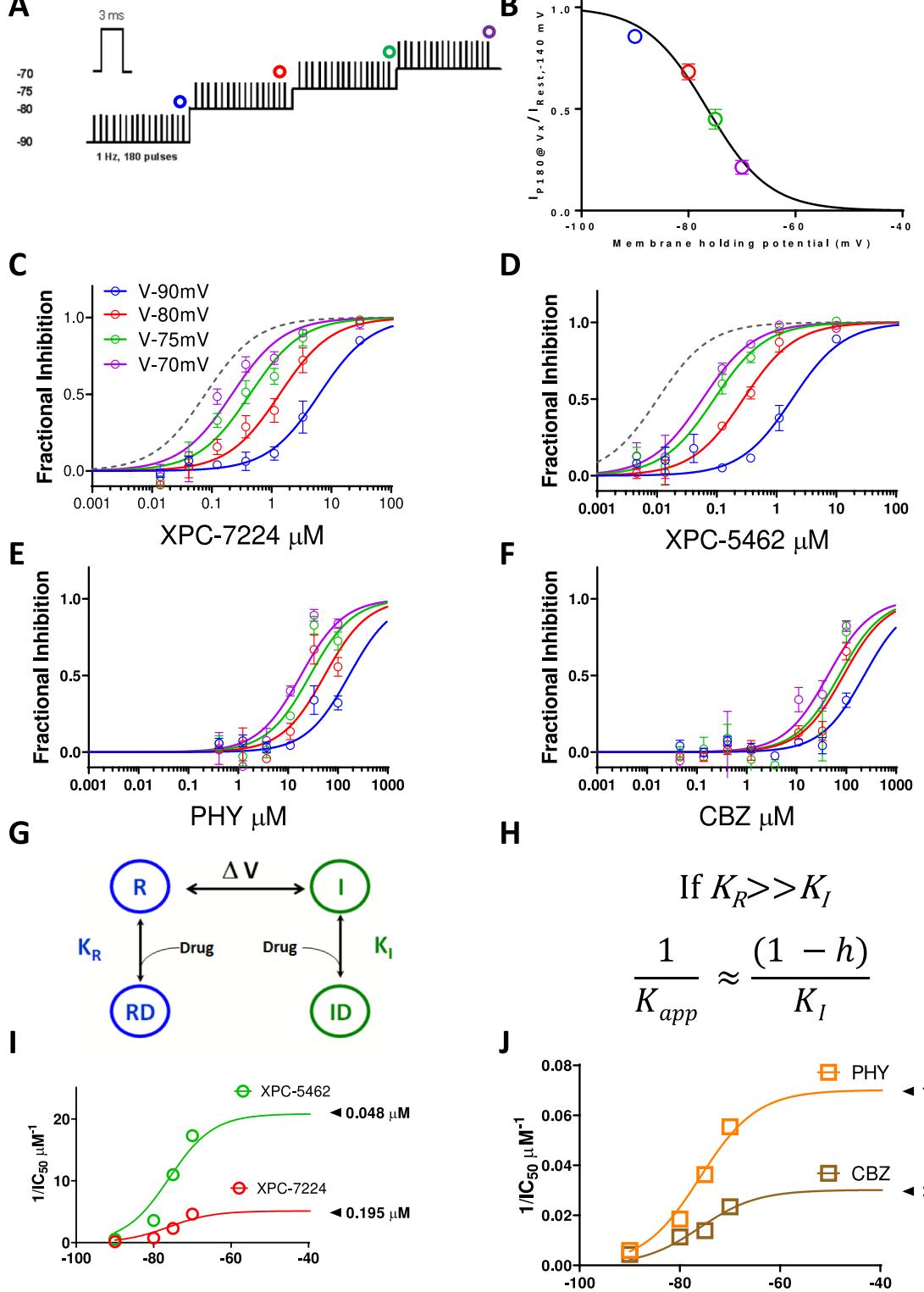 XPC-7224 and XPC-5462 Potency Are Highly Inactivated State-Dependent. We next tested the XPC compounds’ potency at a membrane potential of where the channels were fully available at rest. The potency for was reduced by -fold from to for XPC-7224 ( cells)and from to cells) for XPC-5462, indicating very strong preference for interacting with the inactivated state of the channel (Figure 1G).
