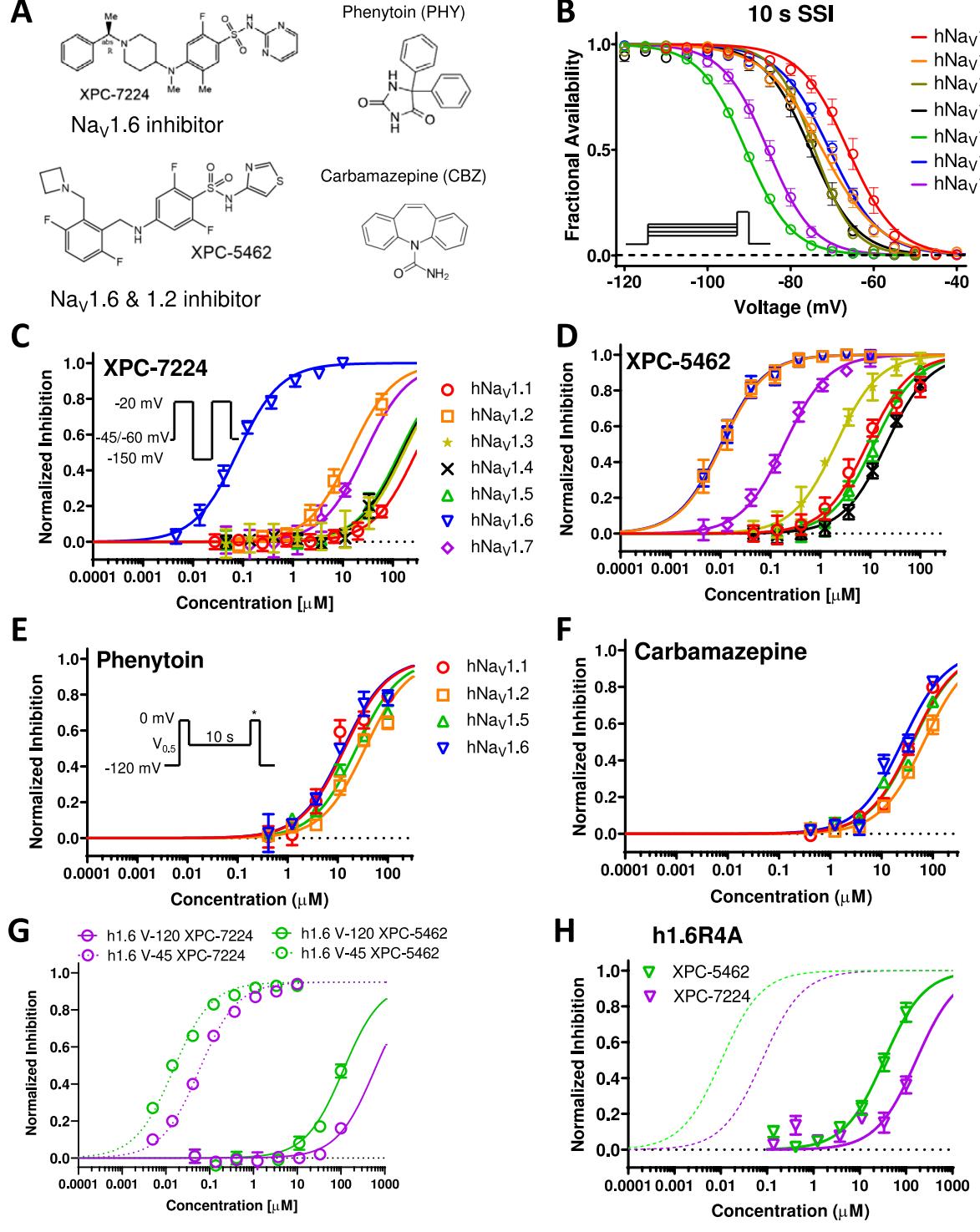 Figure 1. Comparative pharmacology of Nav subtype-selective inhibitors compared with nonselective ASMs. (A) Structures of XPC compounds and classic pore-blocking ASMs, PHT (phenytoin) and CBZ (carbamazepine). (B) Normalized inactivation curves showing different voltage dependence of inactivation across human subtypes (, cells; , cells; , cells; , cells; , cells). © Potency of XPC-7724 plotted as fractional inhibition of different channel subtypes and fitted with a Hill equation, cells per concentration. (D) Potency of XPC-5462, cells per concentration. (E,F) Potency of the pore-blocking ASMs measured using a protocol to capture compounds with fast off rates, cells per concentration. (G) Membrane holding voltage dependence of potency for XPC-7724 ( cells per concentration) and XPC-5462 ( cells per data point). (H) Potencies for R4A channels for XPC-7724 ( cells per concentration) and XPC-5462 ( cells per concentration).