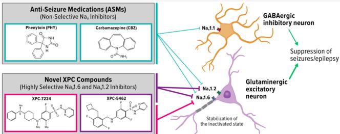 Here, we describe the comparative molecular pharmacology of the selective XPC-7224 and the dual inhibitor of and ,XPC-5462,to the clinically used nonselective -blocking ASMs,PHY and CBZ.We characterize several important biophysical and pharmacological differences between these compounds. The XPC compounds bind distinct sites of the channel, have exquisite selectivity for excitatory subtypes,and display radically different kinetic profiles and state dependence of potency when compared with CBZ and PHY.The proposed mechanism for seizure reduction of this pharmacological profile is then demonstrated in patchclamp recordings from excitatory and inhibitory neurons in adult mice and tested in multielectrode array (MEA) seizure model in acute brain slices.By exploring the differences in selectivity,kinetics,and state dependence,we propose that steady-state inhibition from resting membrane potentials is mechanistically sufficient for reducing excitability in CNS neurons and suppressing seizure-like activity in brain slices.
