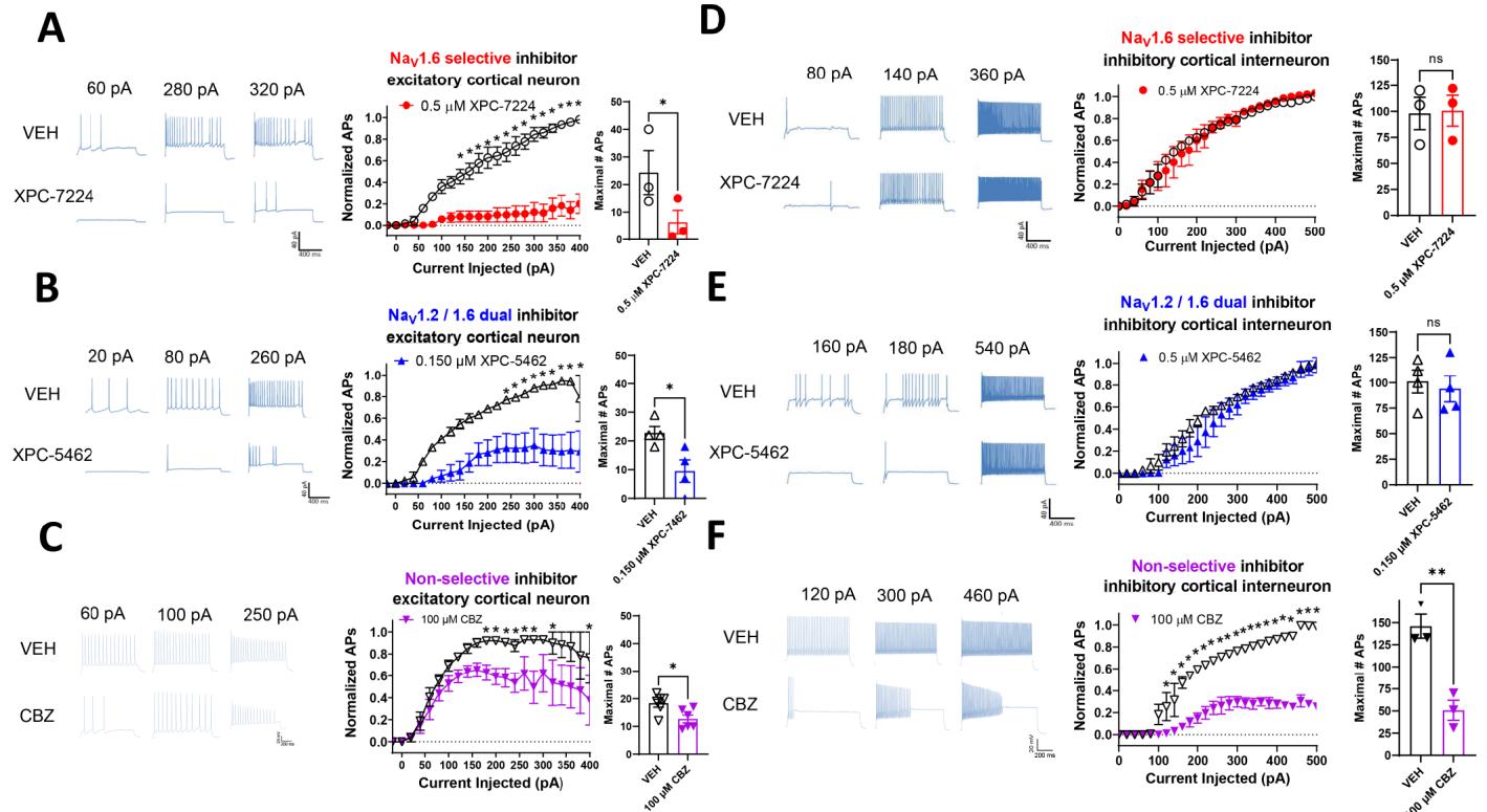 Figure 6. - and -targeting compounds selectively suppress action potentials in cortical excitatory pyramidal cells. Representative voltage traces from current clamp recordings of cortical neurons (A-C) and fast-spiking interneurons (D-F) from selected depolarizing current injections before and after of incubation with the stated concentration of compounds. Middle panels show input-output plots of the number of APs fired, normalized to the mean number of APs of the vehicle control in the same cell, against depolarizing current injection magnitude. Right panels show plots of the absolute maximum number of APs from the range of current injections in vehicle or compound. (A) XPC-7724 at significantly inhibited AP firing from pyramidal cells but not fast-spiking interneurons (D). (B) XPC-5462 at significantly inhibited AP firing from pyramidal cells but not fast-spiking interneurons (E). © CBZ at significantly inhibited AP firing from pyramidal cells and fast-spiking interneurons (F). Statistical significance between vehicle and compound number of APs across current injection was tested using a two-way ANOVA followed by Bonferroni multiple comparisons test . Student’s two-tailed paired t-tests were used to test the significance of the maximal number of APs fired by each cell in vehicle or compound .