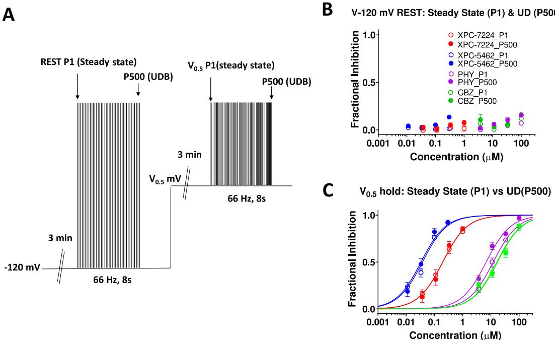 XPC-7224 and XPC-5462 Inhibit Sodium Currents Independently of High Frequency Firing. To assess the use dependence of our VSD-binders,we used a protocol that measured use dependence from the resting states and from a partially inactivated state (empirically derived ),which beter represents neuronal RMP (Figure SA). The mean for all cells was .The normalized current inhibition at first (steady resting-state inhibition) and pulse(use-dependent inhibition) in each of the four compounds from the holding potential show that there is minimal inhibition at any concentration due to the previously described state dependence (Figure SB).Figure 5C shows the partially inactivated steady-state and use-dependent potency from a holding-potential. The for steady-state inhibition from a holding potential (P1) for XPC-7224 was ( CI cells); XPC5 cells), PHY cells),and CBZ cells).For UDB (P500) from the for XPC-7224 was CI ;XPC-5462 0.0334 CI ,PHY CI $5 . 6 7 { - } 8 . 1 4 $ and CBZ . The results indicate that neither the pore-blocking PHY nor our VSDblockers have a large difference in the steady-state vs usedependent potency from either or the This suggests that the VSD-IV-targeting XPC compounds might act primarily through interacting with and inhibiting the steady state rather than increasing inhibition over short highfrequency bursts. Given that selective VSD-binders show efficacy in animal models4 these data suggest that usedependent block is not required for inhibition of hyperexcitability from moderate membrane voltages.