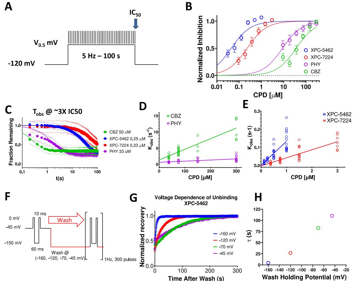 XPC-7224 and XPC-5462 Have Slower Binding Kinetics Compared with PHY and CBZ.Equilibrium measurements are commonly used as a proxy for the dissociation constant ,assuming that inhibition is tightly coupled to binding. Equilibrium measurements, however, yield no information about the kinetics of binding, which may play an important role in the physiological activity of a drug and are determined by intrinsic chemical rates of association and dissociation ( and ) and are proportional to the transitional state energy barriers encountered by a ligand when engaging or dissociating from the binding site and, therefore, give information about what is driving potency; the rate of binding or unbinding or a combination of both.’ We measured the kinetics of binding to channels using a protocol that tracks the inhibition over 100 s of holding at the (Figure 3A). The potencies for the compounds are measured at the end of 1 0 0 \textbf { \em s } at the (Figure 3B). The mean normalized rate of inhibition was observed at approximately 3 times the of each compound to enable comparison of the kinetics at a concentration that is proportional to the equilibrium (Figure 3C). The mean data were fit with a single exponential function to give the following values; XPC-5462:36.8 s ( CI (204 cells), XPC7224:84 s ( CI 62.1-125 s, cells), CBZ:0.29 s CI 0.182-0.419 s, cells),and PHY: 1.86 s ( C cells). CBZ and PHY are and faster, respectively, to equilibrate than XPC compounds, highlighting a profound kinetic distinction between the mechanisms of action of traditional pore-blockers and our XPC compounds.