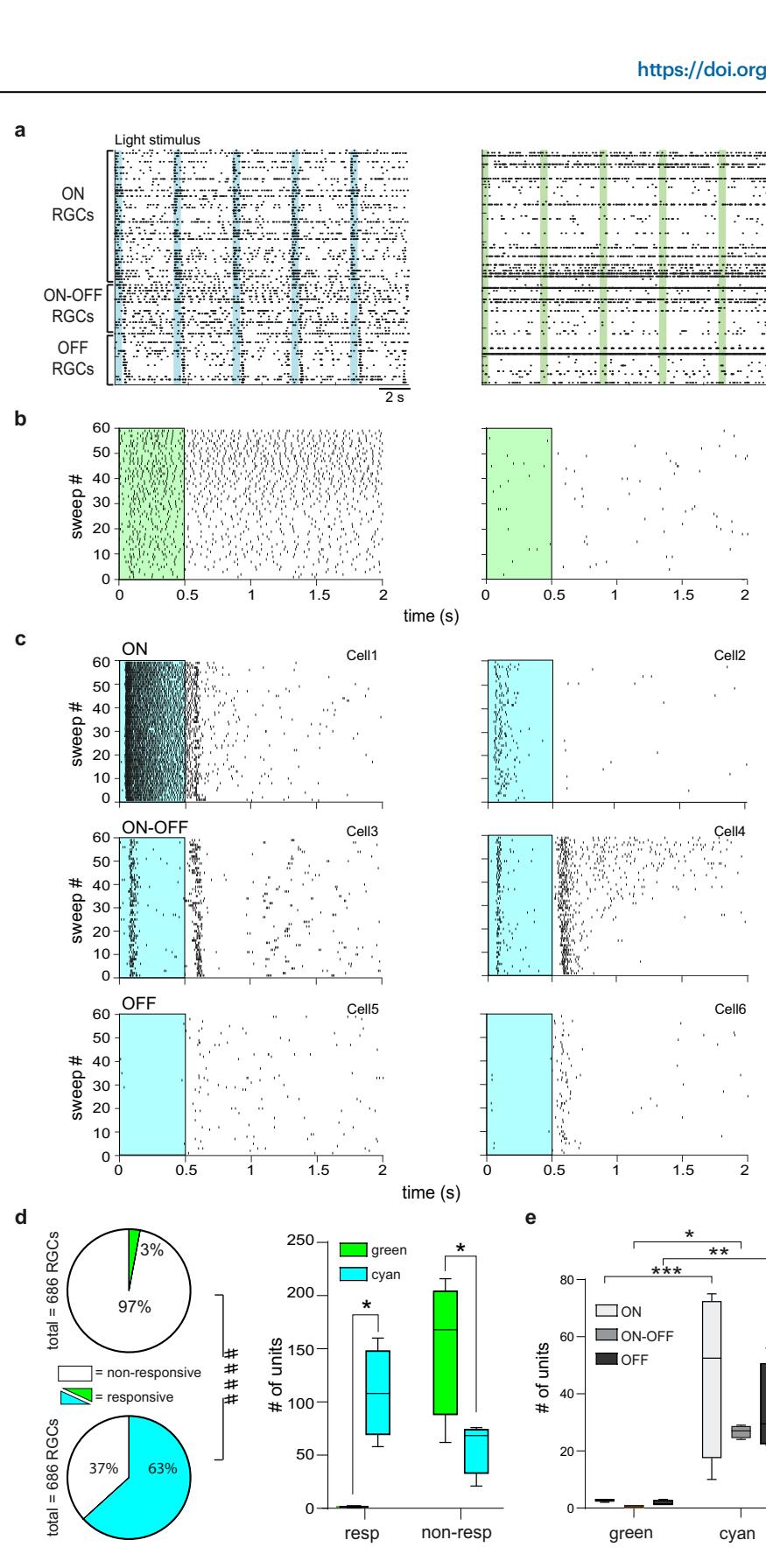 Fig. 4 | Ziapin2 restores the ability of degenerate rd10 retinas to analyze visual information in segregated channels. a Representative AP raster plots obtained from HD-MEA recordings of the same rd10 blind retinal explant after incubation with Ziapin2 (10 µM) stimulated with either cyan (left) or green (right) light (500 ms; 2 mW/mm2 ). Each row represents the firing activity of single RGCs that were sorted for polarity. Light-dependent firing activity was only restored with full-field cyan, but not green, light stimulation. Light pulses are indicated with vertical color-coded bars. b Representative raster plots of APs generated by two RGCs with very different spontaneous activity over 60 sweeps. In both cells, green light stimulation (green rectangle) could not modulate firing activity. c Representative raster plots of AP firing of different classes of RGCs in response to full-field stimulation with cyan light (cyan rectangle). Cyan stimuli evoked ON-sustained (Cell1), ON transient (Cell2), ON-OFF (Cell3, Cell4), OFF-suppressed (Cell5) and OFF-transient (Cell6) responses. d Left: Pie charts represent the percentage of RGCs responsive to light stimulation with green (top) and cyan (bottom) light with respect to the total number of RGCs recorded by HD-MEA (numbers reported in parenthesis). ***p < 0.001, two-sided Fisher’s exact test; responsive/non-responsive RGCs to green versus cyan light. Right: Box plots showing the number of responsive and non-responsive RGCs to either cyan or green light stimuli in the retinas from n = 4 rd10 mice. The box plot center line represents the mean, the square in the box is the median, the box boundaries are the first and third quartile, and the whiskers are the minimum and maximum of data. e Box plots showing the number of ON, ON-OFF, and OFF RGCs responsive to either cyan or green light stimuli in the retinas from n = 4 rd10 mice. The box plot center line represents the mean, the square in the box is the median, the box boundaries are the first and third quartile, and the whiskers are the minimum and maximum of data. ####p < 0.0001, Fisher’s exact test; responsive/non-responsive RGCs to green versus cyan light; *p < 0.05, **p < 0.01, ***p < 0.001, two-way ANOVA/Holm–Šídák tests (n = 4). Exact p-values and source data are provided as a Source Data file.