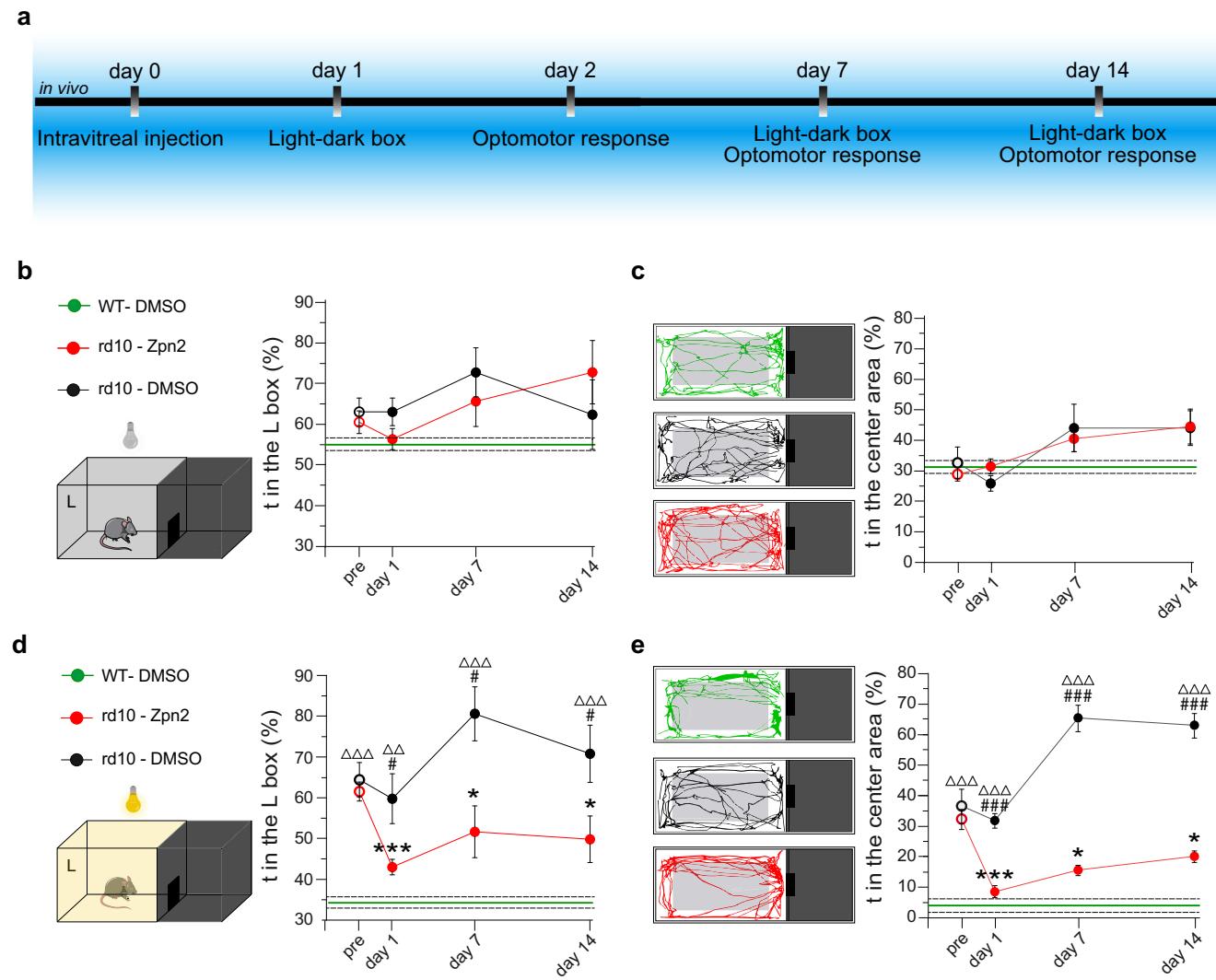 Fig. 7 | Light sensitivity is restored in blind rd10 mice after in vivo administration of Ziapin2. a Experimental timeline indicating the in vivo procedures performed in 6-month-old blind rd10 mice and aged-matched WT mice subjected to the bilateral intravitreal injection of either vehicle or Ziapin2 in saline. b Schematic representation of the Light-Dark box apparatus kept entirely in the dark. The time-course on the right shows the mean (± SEM) percent time spent in the left compartment (L) over the total duration of the test by blind rd10 mice injected with either vehicle (DMSO; black) or Ziapin2 (red). Vehicle-injected WT mice (green; mean ± SEM) are shown for comparison (mean: solid horizontal line; SEM, broken lines). c Representative animal tracks in the left compartment for the three experimental groups described in (b). The time-course on the right shows the mean (± SEM) percent time spent in the center area of the left compartment (gray rectangle) over the 3-min of observation. Vehicle-injected WT mice (green; mean ± SEM) are shown for comparison. d Schematic of the apparatus during the light condition (5-lux white light in the left compartment). The time-course on the right shows the mean (± SEM) percent time spent in the lighted compartment over the 3-min test by the three experimental groups. Vehicle-injected WT mice (green; mean ± SEM) are shown for comparison. e Representative animal tracks in the lighted left compartment for the three experimental groups described in (d). The time-course on the right shows the mean (± SEM) percent time spent in the center area of the left compartment. Vehicle-injected WT mice (green; mean ± SEM) are shown for comparison. *p < 0.05, ***p < 0.001, one-way ANOVA/Dunnett’s tests versus “pre” within group; # p < 0.05, ##p < 0.01, ###p < 0.001, one-way ANOVA/ Tukey’s tests versus rd10/Ziapin2; ΔΔp < 0.01, ΔΔΔp < 0.001, one-way ANOVA/Tukey’s tests versus WT/DMSO (WT/DMSO, n = 7; rd10/DMSO, n = 14; rd10/Ziapin2, n = 18). g ****p < 0.0001, two-sided Fisher’s exact test; ##p < 0.01, ###p < 0.001, two-way ANOVA/Holm–Šídák tests (n = 3 for both rd10 mice/DMSO and rd10 mice/Ziapin2). Exact p-values and source data are provided as a Source Data file. Created in BioRender. Benfenati, F. (2024) https://BioRender.com/o06m024.