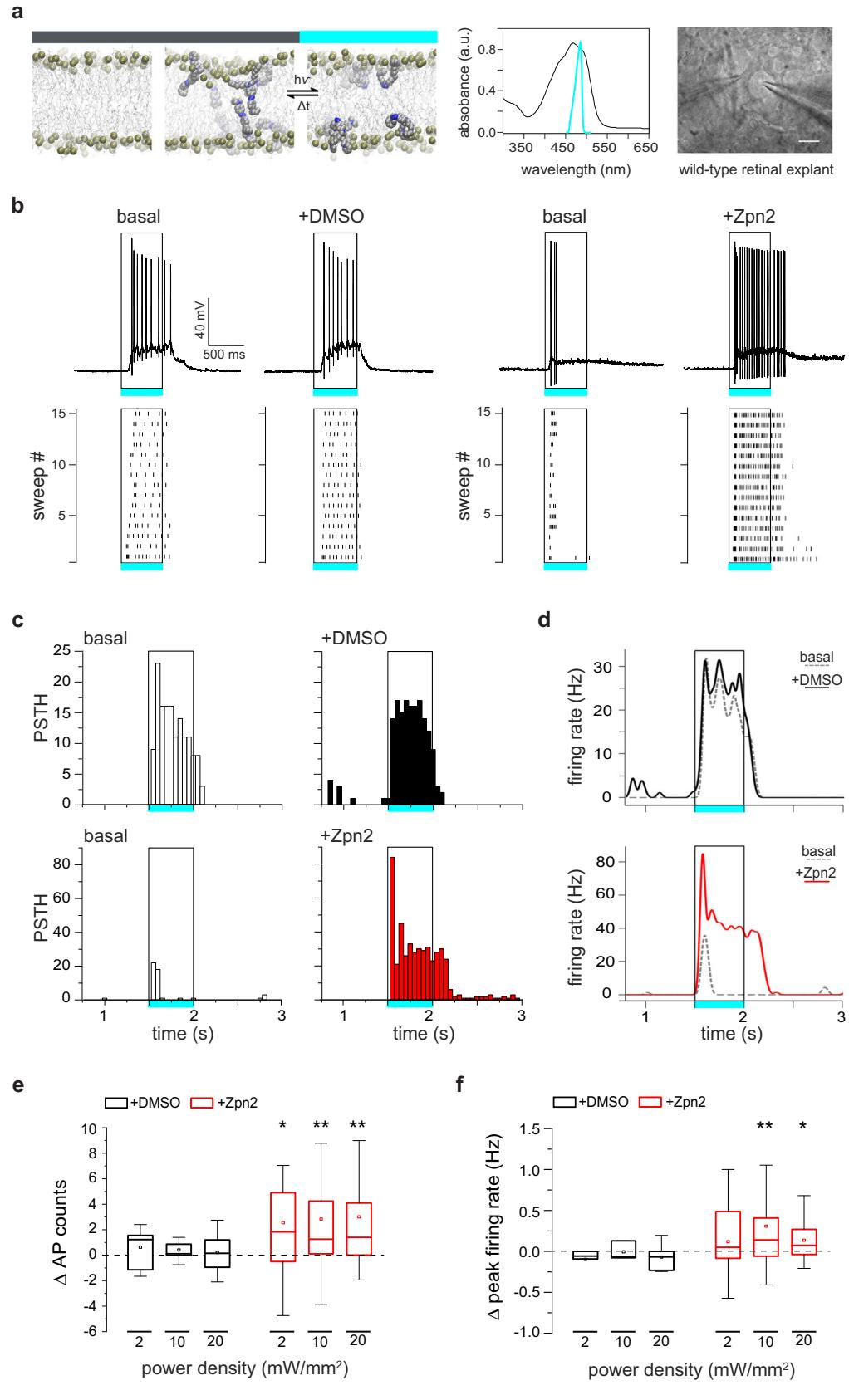 Fig. 1 | Ziapin2 enhances light-evoked RGC firing activity in the WT retina. a Left: Molecular structure of Ziapin2 and its topology after spontaneous membrane insertion: Ziapin2 incorporates into a phospholipid bilayer (left) in the dark and self-associates as trans-isomers on opposite leaflets (middle), causing membrane shrinking, which is reversed by cyan light-induced conversion to the cis conformation (right). Modified from49. Middle: Ziapin2 UV–vis absorption spectrum in DMSO (black trace; absorption peak, 470 nm), superimposed to the spectral output of the cyan LED used in the study. Right: Image of an RGC with a puff pipette (left) for the application of Ziapin2 and a patch pipette(right). Scale bar, 20 µm. b Representative current-clamp traces (top) and corresponding raster plots (bottom; 15 sweeps) recorded in two distinct RGCs from WT mouse retinal explants before (basal) and after the administration of either vehicle (10% v/v DMSO) or Ziapin2 (200 µM), showing an enhancement of light-evoked AP firing upon stimulation with cyan light (500 ms, 20 mW/mm2 ; open rectangle) of the Ziapin2-treated neuron. c Representative peristimulus time histograms (PSTHs) of the two RGCs as in (b), showing AP counts (50-ms bins) in response to cyan-light stimulation before (basal, open columns) and after the administration of either DMSO (top row, black columns) or Ziapin2 (bottom row, red columns). Rectangles frame the responses during the cyan light stimulus (500 ms, 20 mW/mm2 ). d Changes in the firing rate of the two RGCs shown in (b) under basal conditions (dashed gray lines) and after the subsequent application of either DMSO (top, black line) or Ziapin2 (bottom, red line). The timing of the cyan-light stimulus (500 ms, 20 mW/mm2 ) is represented by the open rectangle. e, f Box plots representing the cyan light-evoked changes in AP counts (e) and peak firing rates (f) with respect to the basal condition at increasing power densities (2, 10, and 20 mW/mm2 ) after the application of either DMSO (black boxes) or Ziapin2 (red boxes). Changes are expressed as the difference (Δ) between Ziapin2/DMSO puff application and the basal condition. The box plot center line represents the mean, the square inside indicates the median, box boundaries show the first and third quartiles, and whiskers display the minimum and maximum values. *p < 0.05, **p < 0.01; two-tailed paired Wilcoxon’s signedrank test versus basal (n = 12 and 34 RGCs for DMSO and Ziapin2, respectively). Exact p-values and source data are provided as a Source Data file.