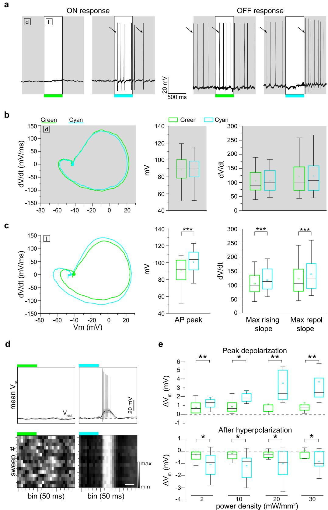 Fig. 5 | The light-evoked capacitance change by Ziapin2 induces faster AP dynamics and membrane in degenerate rd10 retinas. a Representative currentclamp traces of two RGCs from blind rd10 retinas incubated with Ziapin2 (10 µM), showing ON (left) and OFF (right) responses to cyan (right traces) but not to green light (left traces). The open rectangles represent the timing of the light stimuli (500 ms, 20 mW/mm2 ). Arrows indicate the first AP in the dark (d) and in response to light (l) used to perform the waveform analysis shown in (b). b Left: Representative phase-plane plot analysis of the first AP generated in the same RGCs shown in (a) in the dark (d), before light stimulation. Right: Box plots showing AP peak, maximal rising slope, and maximal repolarizing slope in the dark calculated from the phase plot analysis of all recorded RGCs (n = 28 RGCs). c Left: Representative phase-plane plot analysis of the first AP generated in the same RGCs shown in (a), during green or cyan light stimulation (l). Right: Box plots of AP peak, maximal rising slope, and maximal repolarizing slope after stimulation with either green or cyan light. ***p < 0.001; 2-tailed paired Wilcoxon’s signed-rank test (n = 28 RGCs). d Top: Representative lowpass-filtered voltage traces recorded from RGCs incubated with Ziapin2 (10 µM) in a time window of 1.5 s, starting from the onset of either green (left) or cyan (right) light stimulation (500 ms, 20 mW/mm2 ). The plots display the mean (± SD, gray area) Vm calculated within the same time window over 15 sweeps. Vrest (dashed line), membrane potential in the dark. APs evoked with cyan light are superimposed on the voltage traces. Bottom: Grayscale representation of Vm changes during the 15 sweeps (50-ms bins). Scale bar, 250 ms. e Box plots of peak depolarization (top) and peak after-hyperpolarization (bottom) calculated as the difference with respect to Vrest (see d) in RGCs treated with Ziapin2 and stimulated with either green or cyan light (colored boxes) at increasing power densities (2, 10, 20, and 30 mW/mm2 ) (n = 14 RGCs). The box plot center line represents the mean, the square in the box is the median, box boundaries show the first and third quartiles, and whiskers display the minimum and maximum values. *p < 0.05; **p < 0.01; two-tailed paired Wilcoxon’s signed-rank test cyan- versus green-light stimulation Exact p-values and source data are provided as a Source Data file.